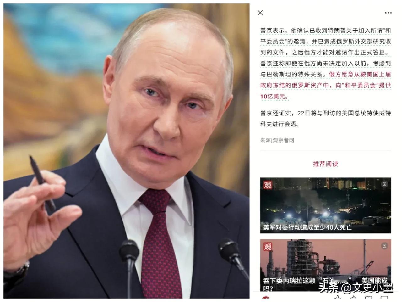 普京已经接受了特朗普的入会邀请, 同时他打算拿出10亿美元, 获得永久性会员资格, 不过这笔钱不是直接从俄罗斯出, 而是用美国在拜登执政时, 冻结的俄罗斯资产, 很佩服普京这一步棋, 因为这些冻结的资产很难再回到俄罗斯 还不如借这个事投给美国, 让美国明面上以为占了大便宜, 其实竹篮打水,一场空, 白送给俄罗斯一个永久会员! 就是不知道特朗普会作何回应!