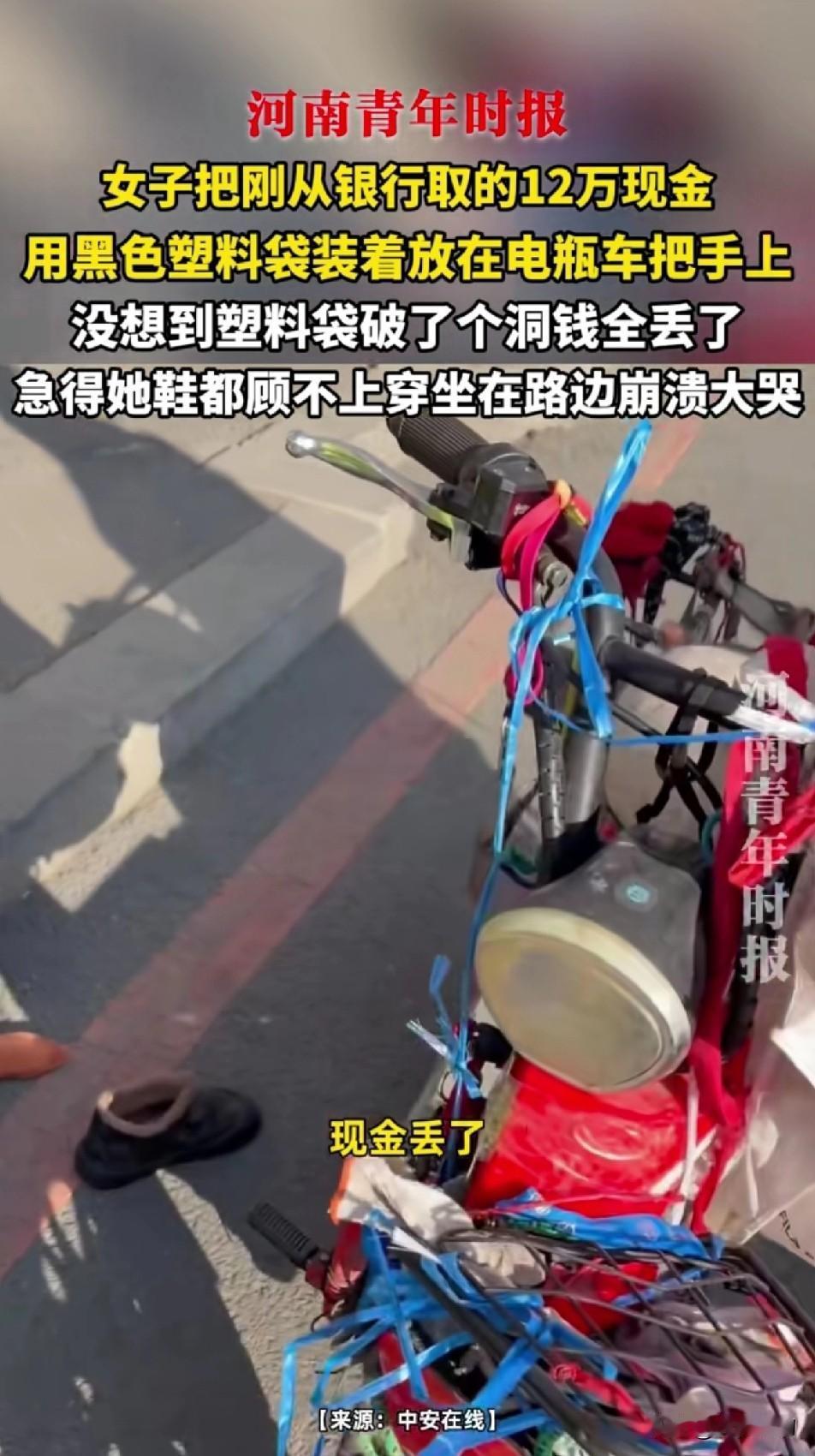 1月21日,事发辽宁,一女用黑色塑料袋装12万现金挂于小电驴上,殊不知黑色塑料袋中途破了个大洞,现金全丢了,女子发现钱丢了之后瞬间崩溃坐在地上大哭。 评:这是自己太大意了,哭有什么用呢?先冷静,冷静,第一时间报警,然后回忆一下小电驴从银行出来所经过的路线,途中有没有接触搭讪过什么人,电动车沿途刮到了什么东西没有,因为塑料袋不会无缘无故破的。这钱应该可以找到或追回的,大家觉得呢?