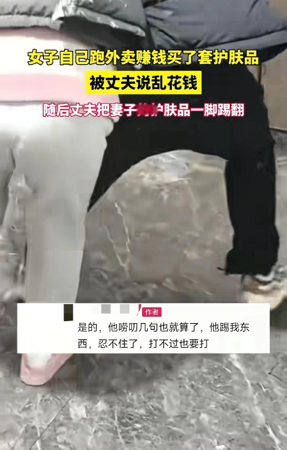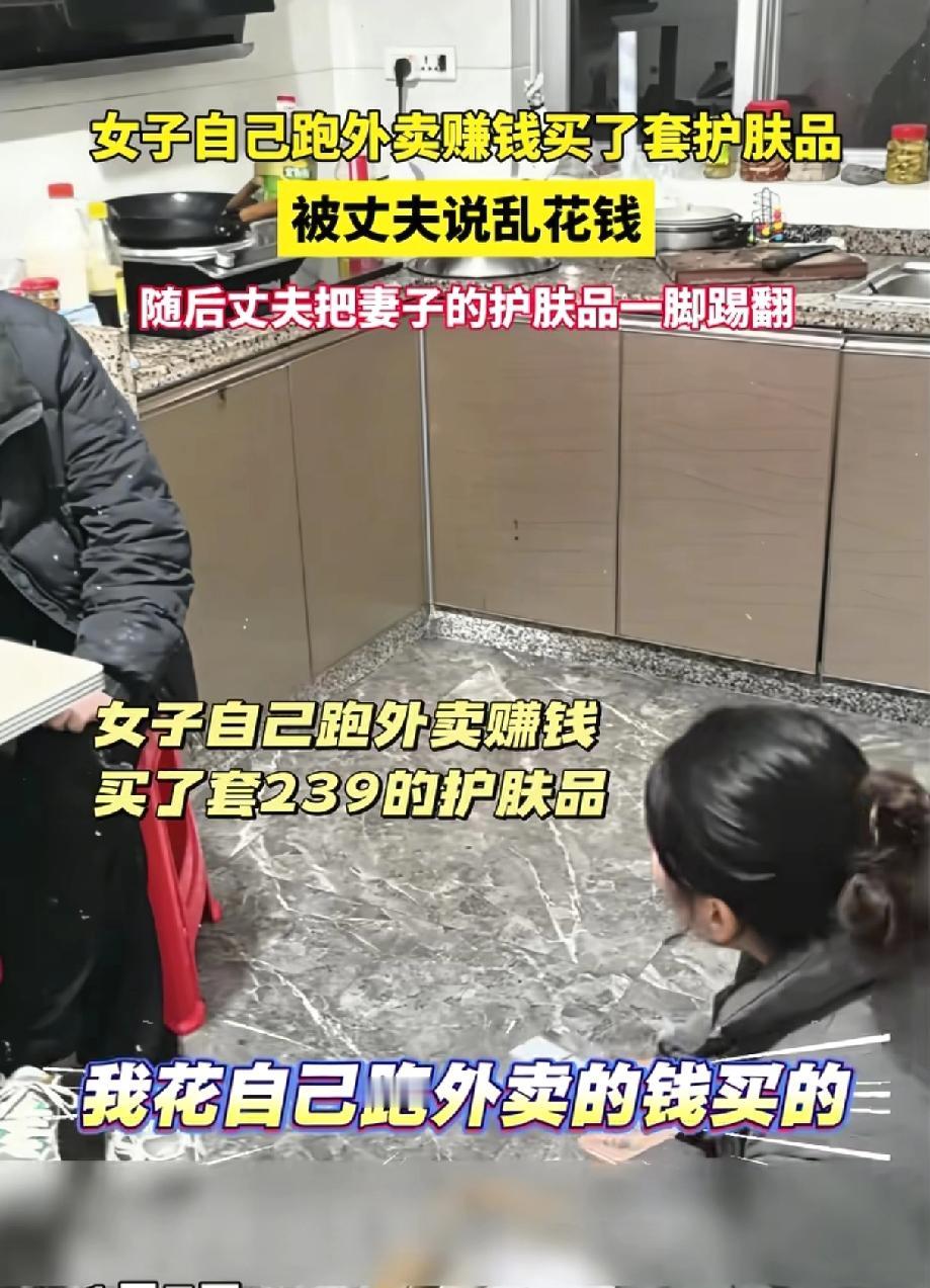 一女子送外卖 挣了钱,自己给自己买了一套239元的护肤品 快递拿回来正满心欢喜的拆包装的时候 女子丈夫却说她乱花钱,买那有啥用 说着说着就一脚把女子的护肤品踢走了 女子愣了一下,然后立马起来和丈夫扭打在一起 在我看来男子做的过分了 239元不贵啊,而且可以用好久,关键是自己挣的呀 唉!