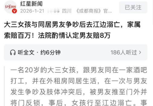 湖北武汉,女大学生在酒吧玩了一宿,第二天早上回到住处后,与男友发生争吵,二人在拉扯过程中不小心把穿衣镜带倒,碎片把女子划伤,之后被男友推出门外并反锁,女子一气之下跑到江边。几个小时后,男友及朋友一起去寻找女子,结果竟被告知女子已经溺亡,事后,女子父母将男友告上法庭,要求赔偿104万,没想到一审二审最后这样判了! 春日的长江边本该是微风拂面的惬意场景,却在2024年4月的一个清晨,定格成一场令人心碎的悲剧。 一条鲜活的20岁生命消逝在江水中,背后牵扯出的感情纠葛、冷漠疏忽与司法裁决,不仅让两个家庭陷入深渊,更引发了关于亲密关系边界与生命敬畏的深层思考。 这场悲剧的主角是武汉某高校的大三女生小苏,本该在校园里追逐梦想的年纪,她却选择和男友王某一起在外租房,两人还共同在当地一家酒吧务工,偏离了传统的校园生活轨迹。 2024年4月1日晚,小苏在酒吧通宵饮酒唱歌,酒精的麻痹与熬夜的疲惫,让她的情绪本就处于脆弱边缘。 次日清晨8点多,天已大亮,醉醺醺的小苏踉跄着回到出租屋,等待她的不是关心与照料,而是男友王某冰冷的态度。 两人在前一晚已产生矛盾,王某甚至提前删除了小苏的微信,决裂的信号早已埋下,积压的情绪瞬间爆发,两人从口角争执迅速升级为肢体拉扯。 混乱中,小苏掀翻了桌上的物品,碗碟摔落一地碎裂作响,随后两人的拉扯又带倒了立在墙边的全身镜,锋利的玻璃碎片飞溅开来,在小苏身上划出数道血痕。 伤口的疼痛并未平息怒火,王某被小苏的举动彻底激怒,不顾她身上的伤口与狼狈,直接将人推到门外,“砰”的一声反锁了房门,隔绝了所有沟通的可能。 此时,两人共同的朋友杨某恰好在场,他简单帮小苏清理了伤口便留在屋内,没有再多劝阻。 几分钟后,满心委屈与愤怒的小苏独自走下楼梯,身影渐渐消失在街头,而屋内的王某却毫无追出去的打算,反而和杨某一起喝起了酒,还不停抱怨小苏脾气差、不懂事。 或许是尚存一丝惦记,两人每隔十分钟便会通过手机定位查看小苏的位置,屏幕上显示,小苏的身影停在了长江边,始终没有移动。 杨某提议赶紧过去看看,担心孤身一人的小苏出意外,但王某却满不在乎,只说小苏以前心情不好也常去江边散心,等她气消了自然会打电话让自己去接。 这份基于过往经验的轻视,彻底阻断了最后的救援可能,当天上午9点39分,王某曾给小苏打过电话,无人接听的结果也只被他归为“赌气”。 直到约10点,定位突然显示小苏的位置进入了江水中,两人依旧没有立刻行动,直到11点多酒意渐消,才慢悠悠地前往江边寻找。 江面平静无波,却再也找不到那个鲜活的身影,王某接到警方电话时,才得知小苏已经溺亡的噩耗,现场辨认尸体的他,瞬间陷入了呆滞与悔恨。 警方调查后初步分析,小苏系生前溺水死亡,这场因琐碎争执引发的悲剧,最终以最惨痛的方式落幕。 悲痛欲绝的小苏父母,将所有怒火与怨恨指向了王某,他们认为女儿的死与王某脱不了干系,遂将其告上法庭,索赔104万余元。 家属在诉讼中提到,王某并非一时冲动,而是长期对小苏实施冷暴力与精神打压,不仅曾因与异性暧昧发生冲突时对小苏动手,还持续贬低她的价值,扭曲其恋爱观。 事发前王某更是明确表示要分手并将小苏赶出出租屋,事发时明知小苏在江边长时间停留却放任不管,发现定位进入江水后也未及时报警,属于故意放任悲剧发生。 面对指控,王某也有自己的辩解,他认为争吵源于小苏的饮酒行为,小苏作为完全民事行为能力人,应对自己的极端选择负责,且小苏父母在本地,更应尽到监护义务。 法院援引《民法典》关于人身损害赔偿的规定审理后认为,小苏溺水原因不明,现有证据无法证明王某事先知晓小苏有自杀倾向,也无法认定其存在法律意义上的救助义务。 但王某将受伤的小苏推出门外并反锁房门的行为,是小苏离家前往江边的直接导火索,间接促成了损害后果的发生。 一审法院据此酌情判定王某赔偿小苏家属8万元,小苏家属不服提起上诉,坚持认为王某的长期暴力与放任行为是悲剧主因。 可二审法院审理后,因家属无法提供足够证据证明“长期暴力诱发自杀”的主张,最终驳回上诉,维持原判。 8万元的赔偿,与104万的诉求相去甚远,更无法弥补一条生命的消逝与家庭的破碎。 在亲密关系中,争吵与矛盾在所难免,但底线是不能切断沟通的渠道,不能放弃对对方生命安全的守护。 感情会有离合,矛盾会有化解,唯有生命不可重来。 无论是亲密关系中的双方,还是身处各类人际关系中的我们,都应牢记,生命才是最重要的,敬畏自己与他人的生命,才能守住人生最基本的底线。 信息来源:深圳新闻网2026-01-21发布:大三女孩与同居男友争吵后在江边溺亡,家属索赔百万