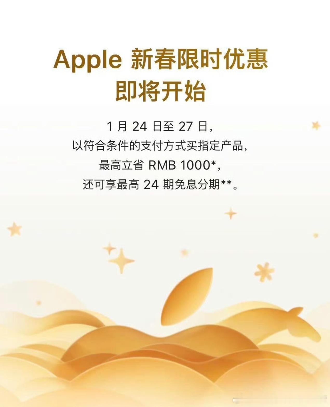 苹果推出新春优惠苹果推出新品特惠,可惜只有三天的时间,最高可以节省1000元的人民币,支持24期免息分期。如果大家近期买苹果产品的话,可以去看看。
