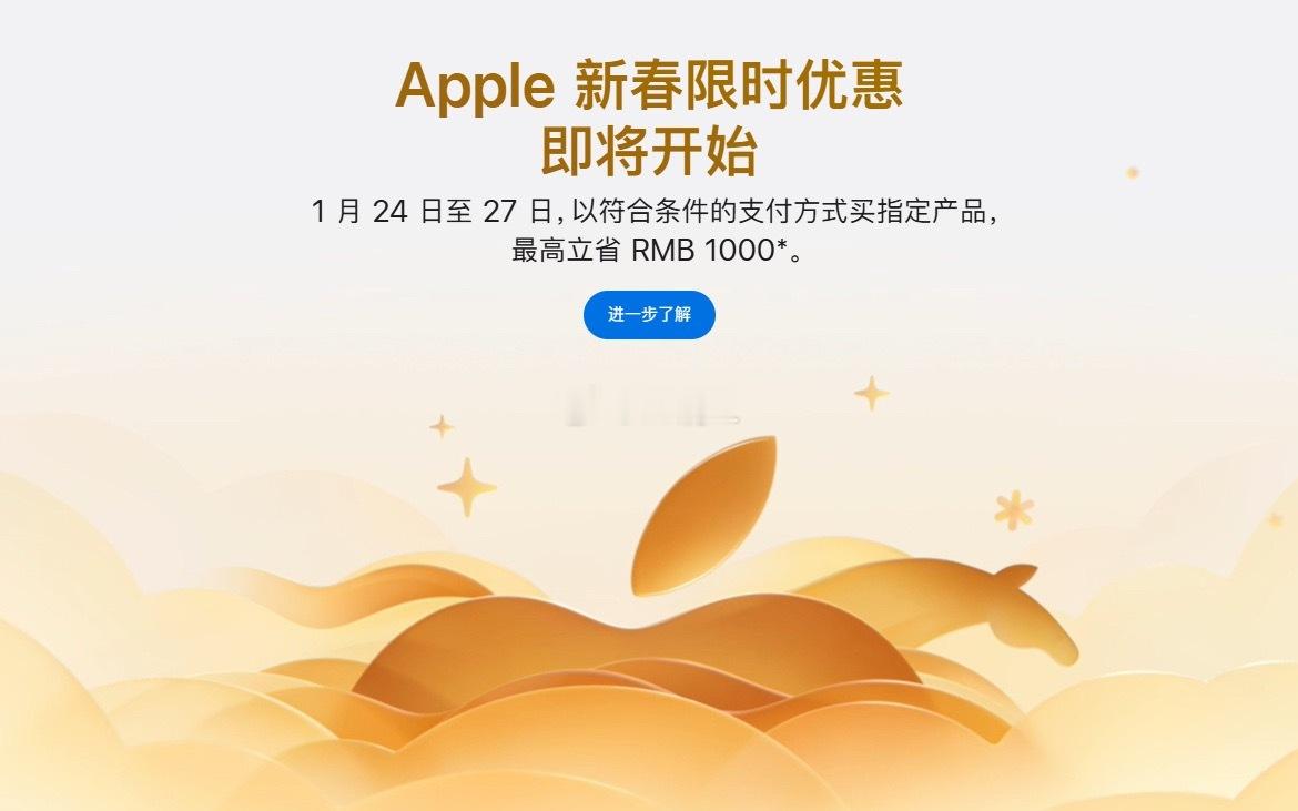苹果推出新春优惠有存储产品涨价高达1000%iPhone17用户反馈存储消耗加快 Apple中国官方网站宣布即将开启新春限时优惠,官方称,1月24日至27日,以符合条件的支付方式买指定产品,最高立省 1000元,还可享最高 24期免息分期。我在这补充一个背景啊。所以目前全球储存的产品都在疯狂涨价,苹果这波算是可以,而且不光没涨价,还有一定优惠。