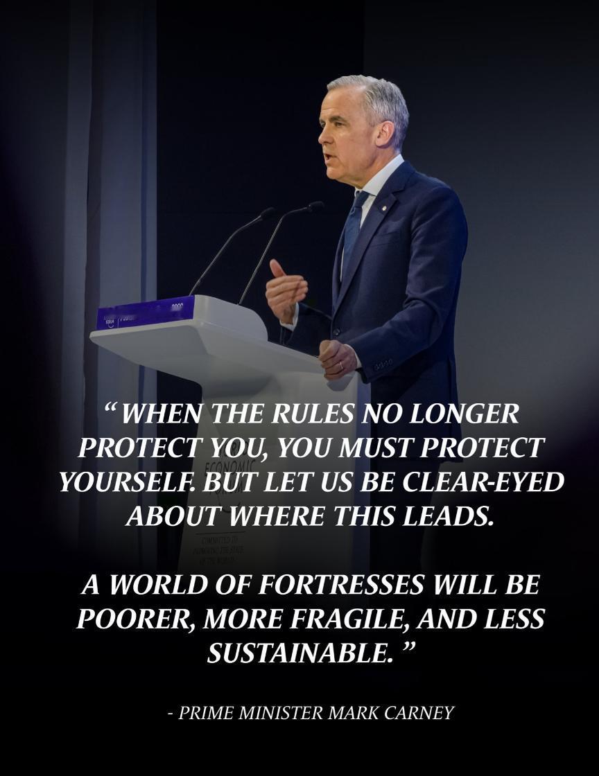 划定时代!以后历史课本上,必有加拿大总理一席之地。 加拿大总理在冰雪中达沃斯演讲,震动了在场所有人,其中那些沉浸在欧洲天朝上国的旧梦中人,也纷纷侧目,在未来的历史中,这一段可能被称为新时代的“铁幕演说” 那这里面有什么主要内容? 我们都知道,二战后维持了近 80 年的国际秩序,说到底就是美西方一手制定的 “游戏规则”,靠着联合国、世界贸易组织、布雷顿森林体系这些框架搭起架子,再凭着 G7 的经济主导权、北约的军事同盟,美西方攥着全球的话语权和规则制定权,让全世界跟着他们的节奏走。 这一套玩法,在冷战后更是被美西方玩到了极致,美国成了唯一的超级大国,动辄以 “世界领导者” 自居,把多边主义当成遮羞布,实则搞小圈子、行单边主义,可这看似牢不可破的秩序,早就从根上烂透了。 尤其是特朗普 2025 年上任后,更是把这层遮羞布撕得干干净净,卡尼在演讲里直言,有些大国正把经济一体化当成 “武器”,把关税当作施压杠杆,把金融基础设施作为胁迫工具,这话里没提美国,但明眼人都知道说的是谁。 加拿大就是这一规则下最直接的受害者,卡尼说加拿大人过去总觉得,靠着得天独厚的地理位置和所谓的同盟关系,就能自动带来繁荣和安全,可如今这种安逸想法早已不复存在,这话里藏着的全是切身的憋屈和无奈。 就连格陵兰岛的归属问题,美国都敢扬言不排除动用武力,连丹麦这样的欧洲盟友都敢硬刚,这哪还有一点所谓 “国际规则” 的样子? 联合国、WTO 这些本该集体解决问题的制度架构,如今也被美西方架空,成了他们谋取私利的工具,这样的秩序,注定逃不过崩塌的命运。 说到底,国际秩序的根基从来都是经济实力,美西方能主导世界近 80 年,靠的是他们的经济优势,而如今这优势早已荡然无存,冰冷的数据就是最有力的证明。 2025 年按购买力平价计算,金砖国家的 GDP 总量已经达到 77 万亿美元,占了全球经济的 40%,而一直以全球经济核心自居的 G7,GDP 总量只有 57 万亿美元,占比仅 30%,这一增一减之间,全球经济格局的天翻地覆一目了然。 更扎心的是,双方的增长速度更是云泥之别,G7 里的美国经济增速不过 2%,德国才 0.3%,英国 0.9%,整个 G7 的平均增速连 1% 都不到,反观金砖国家,印度 6.5%、中国 4.8%、俄罗斯 3%、巴西 3.4%,平均 4.4% 的增速,直接把 G7 甩在了身后。 而且金砖国家从来不是闭门造车,而是在不断扩员壮大,2024 年沙特、伊朗、埃及等国加入,2025 年印尼也正式成为金砖一员。 如今的金砖,人口占了全球的一半还多,对全球经济增长的贡献率超过 50%,能源出口也占了全球 25%,反观 G7,对全球经济增长的贡献率还在持续下跌,预计 2028 年会跌到 27.8%,而金砖会升至 33.6%。 经济权丢了,规则制定权自然也就保不住,欧洲那些还沉浸在 “天朝上国” 旧梦里的精英,看着这些数据,心里怎么可能不虚? 卡尼就是看清了这一点,才敢在达沃斯直言不讳,因为他知道,经济格局的改变,必然会带来国际秩序的重构,这是历史的必然,谁也挡不住。 卡尼说 “以前的独立时代宣告结束了”,这话听着残酷,却是当下最真实的世界模样,而 “不肯加入棋盘,那你就会是棋子”,更是戳中了所有国家,尤其是中等国家和小国的痛点,这也是为什么 G7 代表们会纷纷侧目,因为卡尼把他们一直藏着掖着的真相,彻底说了出来。 其实金砖国家的崛起,就是大国争锋新时代最好的体现,金砖从来不是搞美西方那套排他性的小圈子,而是打造了一个包容的全球南方国家合作平台,如今不仅有正式成员,还有 9 个伙伴国,在全球治理中越来越有话语权。 如今的世界,早已不是美西方一家独大的单极世界,而是多极争锋的新格局,中国、印度这些新兴大国,美国、俄罗斯这些传统大国,都在这盘大棋中各有布局。 而像加拿大这样的中等国家,唯有放弃幻想,认清现实,才能在这盘大棋中找到自己的位置,而卡尼,就是第一个看清这一点,并敢在西方核心舞台上喊出来的西方政要。 卡尼的这次达沃斯演讲,之所以能成为划定时代的标志性事件,就是因为他在历史的关键节点,做了那个敢说真话的人。 他没有和其他西方精英一样,沉浸在美西方主导的旧秩序美梦里,而是直面现实,承认了二战后规则秩序的崩塌,也点透了大国争锋的时代本质。 就像当年丘吉尔的铁幕演说,让全世界看清了冷战的到来,卡尼的这番话,也让全世界看清了当下的世界格局,旧的秩序已经翻篇,新的时代已经到来,没有谁能置身事外。 这样的人,这样的时刻,注定会被写进历史课本,被后人记住,因为他不仅喊醒了沉睡的西方精英,更给全世界所有国家提了醒:在大国争锋的时代,唯有保持清醒,掌握自己的战略自主权,才能不沦为别人的棋子。