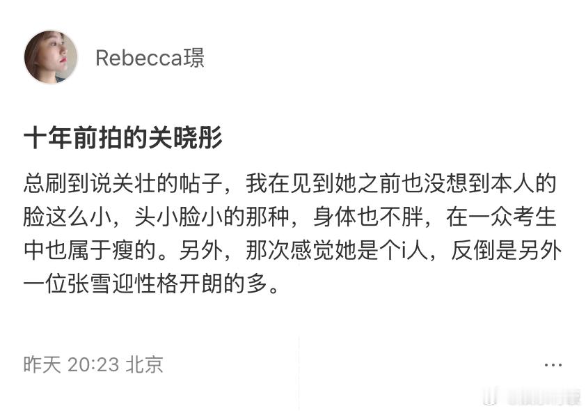 摄影师分享10年前拍的关晓彤摄影师为关晓彤身材发声 近日,摄影师 Rebecca 璟在社交平台分享了 10 年前拍摄的细节,针对网络上 “关壮” 的争议发声,称本人头小脸小,身体并不胖,在一众考生里也属于偏瘦的类型。她还透露,当时的关晓彤性格偏内向,见到她之前也没想到本人的脸这么小。关晓彤