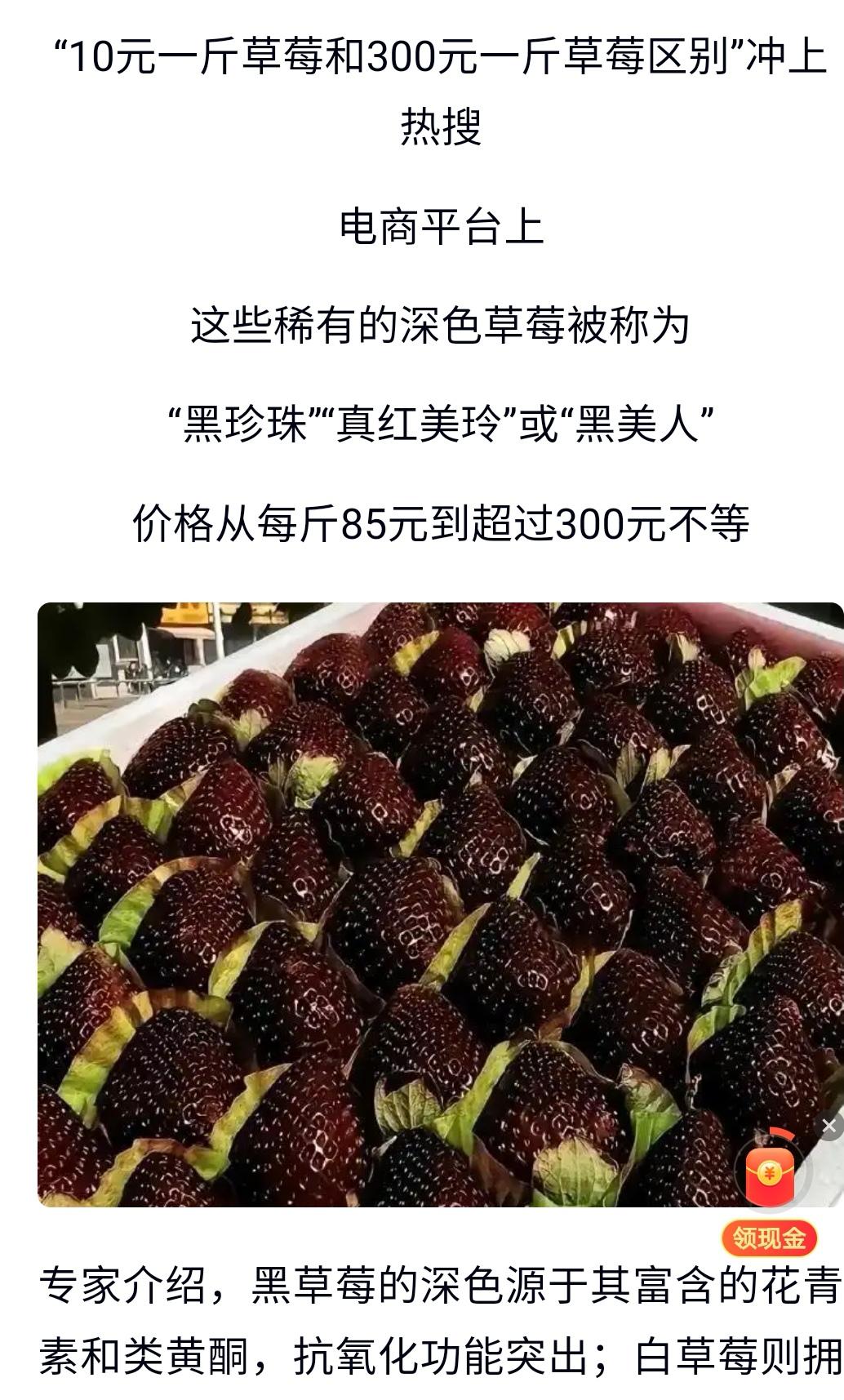 百元黑草莓:高价背后的稀缺逻辑与消费争议 近日,“10元一斤草莓与300元一斤黑草莓”的对比冲上热搜,电商平台中“黑珍珠”“真红美玲”等品种以深黑红色果皮、酒红色果肉和超百元单价引发关注。这场价格争议背后,折射出稀有水果的稀缺性逻辑与消费观念的碰撞。 稀缺性驱动高价:产量仅为普通草莓的15% 黑草莓的高价首先源于其极低的产量。普通红草莓亩产可达5000-6000斤,而黑草莓亩产仅800-1000斤,不足前者的1/5。以武汉东西湖区某草莓园为例,3万株草莓中黑草莓仅占600株,每周产量仅5斤,成熟果实常在1-2天内被抢购一空。种植技术的高门槛进一步加剧了稀缺性:黑草莓需精细化大棚管理,温度需控制在15-25℃,湿度保持60%-80%,且需定期修剪疏果以避免养分争夺。种苗成本也比普通草莓高1元/株,叠加采摘、包装、运输等环节,最终推高售价至普通品种的10-30倍。 口感与营养:甜度翻倍但营养差异有限 黑草莓的口感优势是其高价的核心支撑。普通红草莓甜度约12度,而黑草莓普遍在15度以上,部分品种可达19度,果肉细腻无纤维感,带有淡淡奶香或花香。其深色源于花青素和类黄酮的富集,抗氧化性能是维生素C的20倍、维生素E的50倍,理论上具有延缓衰老、增强血管弹性的功效。然而,专家指出,普通草莓同样富含维生素C、膳食纤维等营养成分,黑草莓的营养优势更多体现在抗氧化物质种类上,而非整体营养价值。 消费争议:尝鲜体验与性价比的博弈 网友对黑草莓的态度呈现两极分化。支持者认为其口感和风味远超普通草莓,硬实果肉更耐储存,适合直接食用或制作甜品,高价买的是“体验感”;反对者则直言“纯属智商税”,认为草莓的本质需求是解馋,10元与300元的品种“吃进肚子里都一样”。值得注意的是,黑草莓价格存在较大差异:甄选大果单斤超300元,而农场直销的同品种大果折合约120元/斤,部分小果或品相一般的仅80-100元/斤。 这场争议本质上是消费者对“性价比”与“体验感”的不同追求。随着草莓育种技术的发展,白草莓、粉草莓等品种相继涌现,市场正通过差异化供给满足多元需求。对于普通消费者,10元一斤的红草莓仍是日常解馋的高性价比选择;若想尝鲜,可选择农场直销的黑草莓,同时需警惕以次充好、虚报价格的产品。