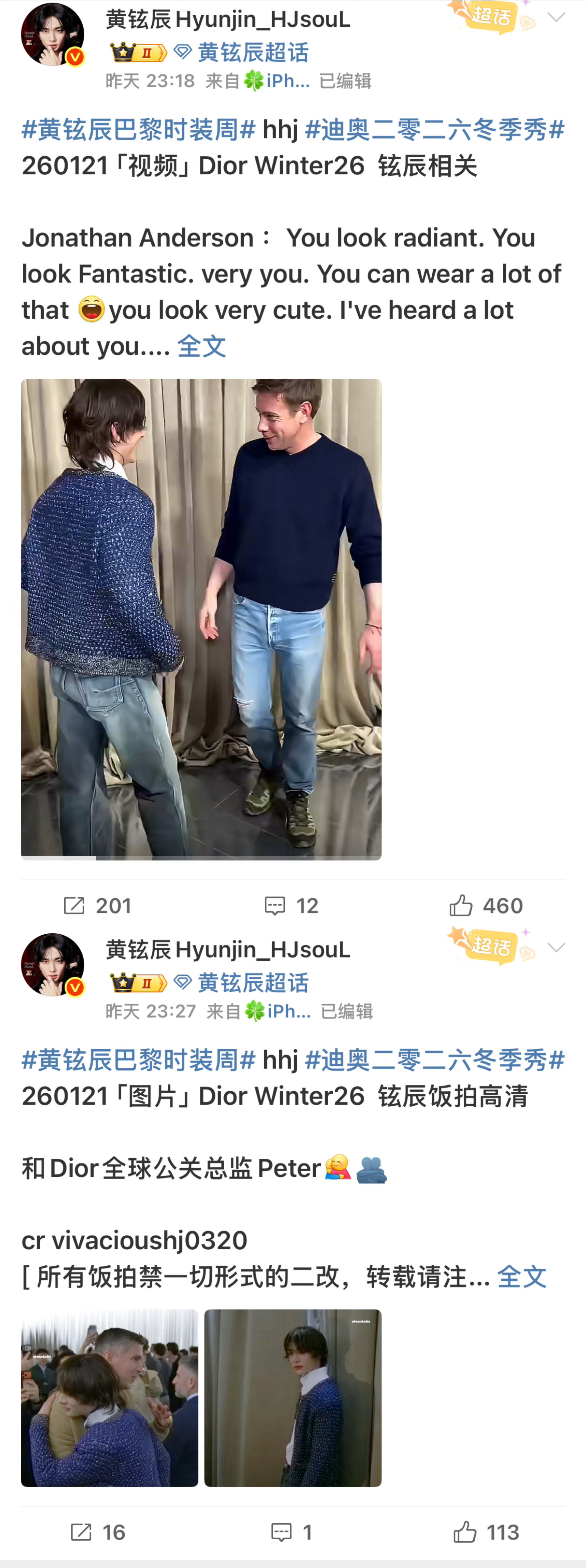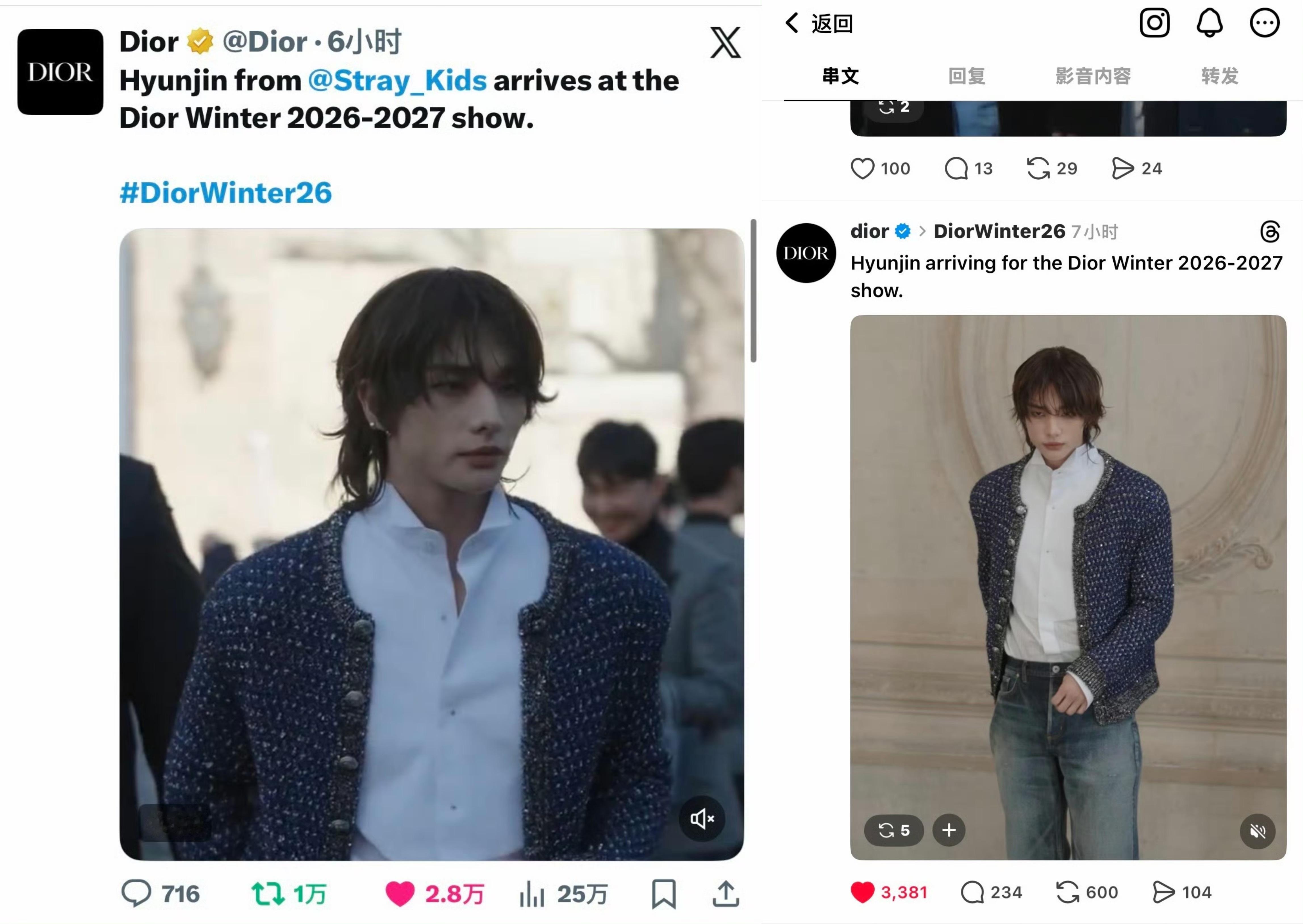 刚参加完迪奥26fw大秀的黄铉辰待遇也太牛了!是唯一获Dior官方在X与Threads双重认领的艺人。ig获官号首个点赞、转发及总监JA等高层点赞;推特认领第一、开场顺位第二。看秀座位位于菲董与品牌gba之间,获Vogue母版、法版及WWD等多方媒体报道。看秀穿搭为未发布服装首穿,鞋款早于秀场亮相
