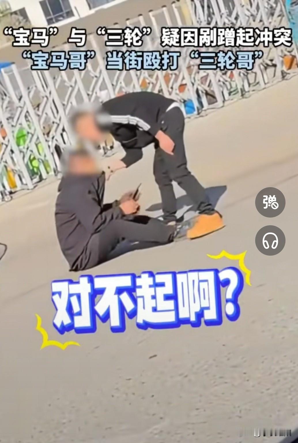 车辆刮蹭很正常,何必高傲把人欺。某地,一辆宝马车和一辆三轮车发生刮蹭,这本就是一件小事,看谁的责任该赔偿的赔偿就完事了。不管怎样你宝马男也不至于当街欺负别人吧,现在是法制社会,不是以前那种欺善怕恶的社会,动手打人在现代法制社会里始终要付出代价。