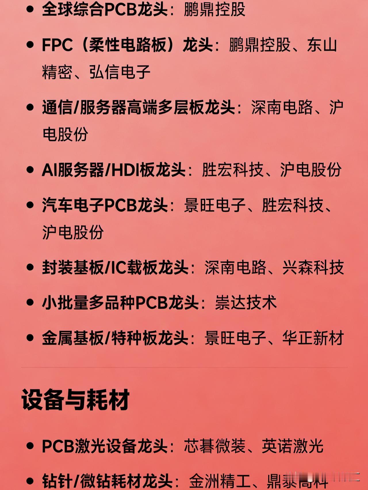 PCB产业链各环节的龙头公司分类汇总 上游材料 覆铜板(CCL)龙头:生益科技、建滔积层板、华正新材、南亚新材 铜箔龙头:嘉元科技、中一科技 玻纤布龙头:中国巨石、泰山玻纤 电子化学品(干膜/油墨)龙头:飞凯材料、容大感光   中游制造 按产品/技术类型: 全球综合PCB龙头:鹏鼎控股 FPC(柔性电路板)龙头:鹏鼎控股、东山精密、弘信电子 通信/服务器高端多层板龙头:深南电路、沪电股份 AI服务器/HDI板龙头:胜宏科技、沪电股份 汽车电子PCB龙头:景旺电子、胜宏科技、沪电股份 封装基板/IC载板龙头:深南电路、兴森科技 小批量多品种PCB龙头:崇达技术 金属基板/特种板龙头:景旺电子、华正新材   设备与耗材 PCB激光设备龙头:芯碁微装、英诺激光 钻针/微钻耗材龙头:金洲精工、鼎泰高科