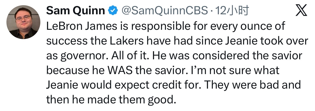CBS记者Sam Quinn:“自从珍妮-巴斯接手湖人管理层以来,球队取得的每一分成功,都要归功于勒布朗-詹姆斯,全部都是。他被视为救世主,因为他就是救世主,我实在想不出珍妮-巴斯凭什么认为自己该获得赞誉,湖人之前烂得一塌糊涂,是勒布朗让球队重回巅峰。”