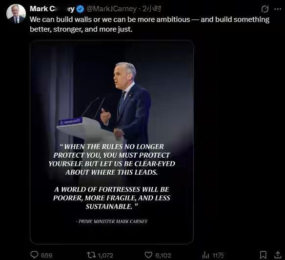 达沃斯炸锅了!西方精英亲口宣告:基于规则的旧秩序已彻底终结。其实,中国方案早已作答。 加拿大总理卡尼,在瑞士达沃斯世界经济论坛年会上宣告:“基于规则的旧秩序已终结,且将一去不返”。“今天,我将谈论世界秩序的破裂、美好故事的终结,以及一个残酷现实的开始”。 ​卡尼的表态堪称西方精英层的“醒世恒言”,直白承认了西式主导的旧秩序合法性崩塌、约束力尽失,这不是一句感慨,而是霸权体系衰落的现实注脚。卡尼说出“旧秩序崩塌”​,但回避了西方为维护霸权,破坏国际规则的根源问题,也没有给出新秩序的答案。 其实,中国方案早已作答。旧秩序落幕之下,中国倡导的共商共建共享全球治理观,才是构建公平合理新秩序的核心方向。世界的未来就是“讲好中国故事”,与中国“命运共同体”! 达沃斯论坛爆重磅表态 西方旧秩序宣告终结 多极化时代不可逆 国际秩序真相