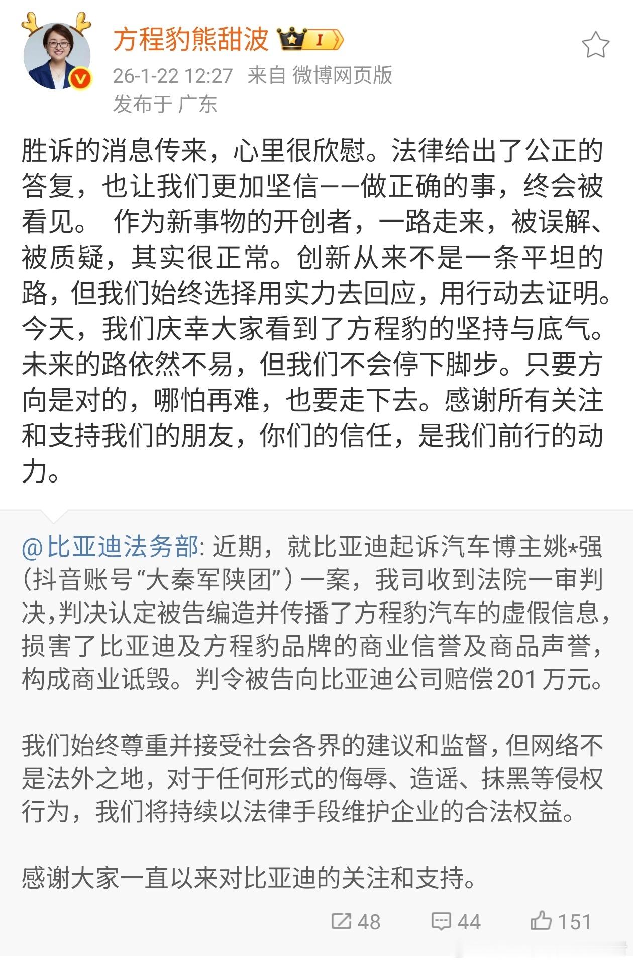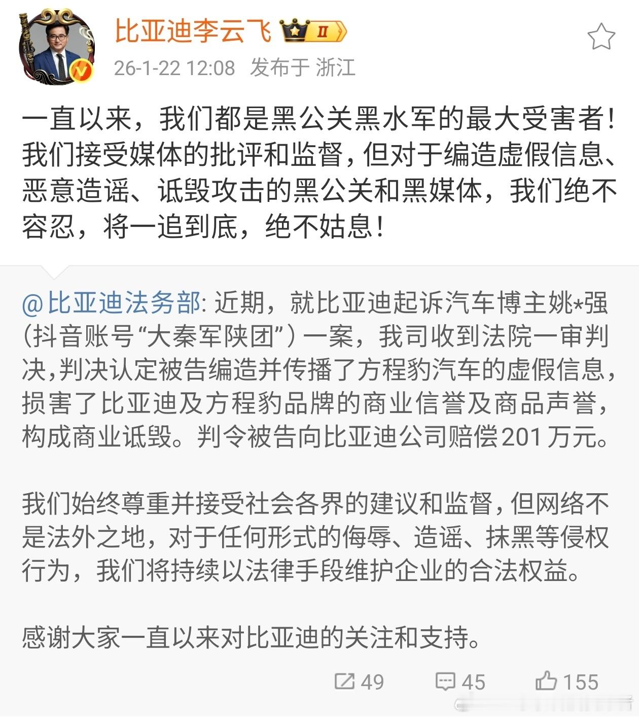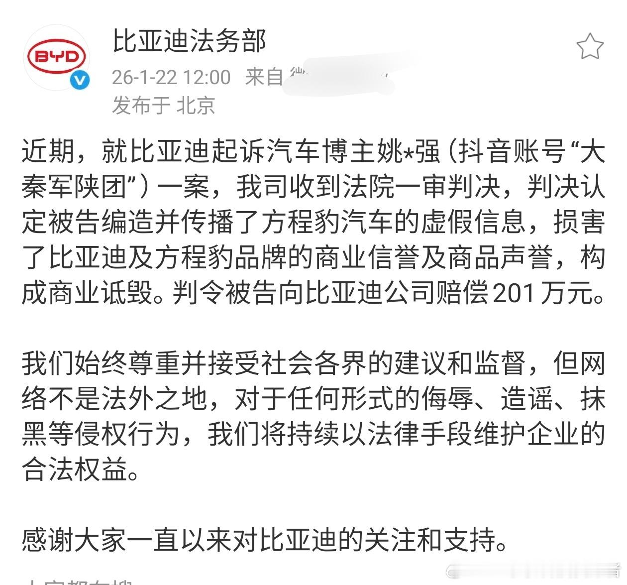 重大好消息!“姚十八”案件终于有结果了,比亚迪法务部官宣。某姚姓汽车博主因为编造和传播方程豹汽车的虚假信息,损害了比亚迪以及方程豹品牌的商业信誉及商品信誉,构成商业诋毁。最终在法院的一审判决之下,这位博主将赔偿比亚迪201万元。说实话还是少了,姚十八引起的舆论非常大,损失不可估量,有很多人被误导了。现在想想,方程豹豹5一路走来真不容易。
