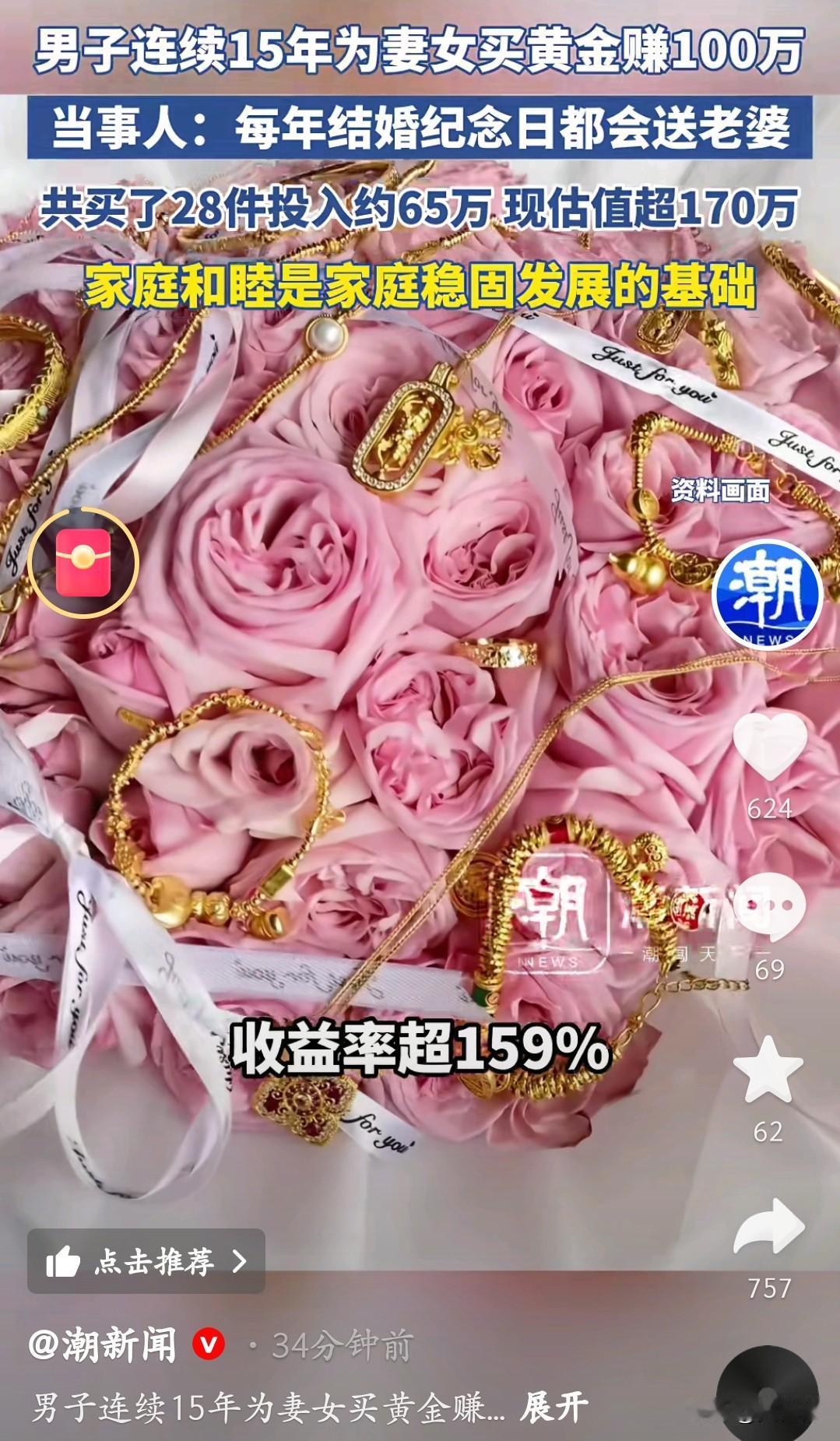坚持给妻女买黄金的第一个受益者出现了!15年时间买黄金赚了100万! 就是这位大哥!他从2011年结婚时给老婆买三金开始,每年结婚纪念日,他都会挑一件金饰送给老婆,既能讨得老婆欢心,又能当作家庭资产。2016年女儿出生后,他又把这份坚持延续到了女儿身上,从满月金镯到周岁金锁,每年都给女儿存一件黄金。 算下来这15年,他一共买了28件黄金饰品,投入大约65万,现在估值已经超过170万,等于稳稳赚了100多万,收益率直接超159%! 浪漫和攒钱两手抓,这才是普通人最实在的幸福。