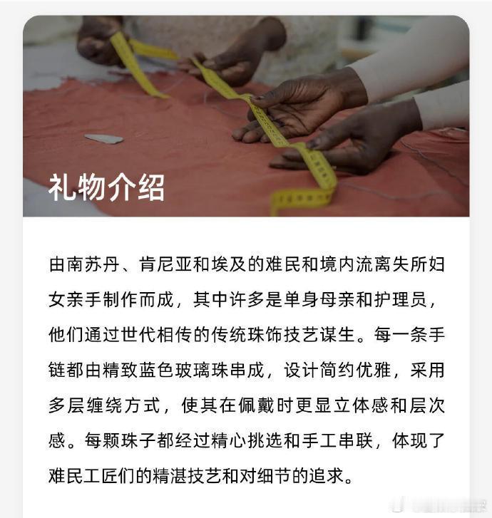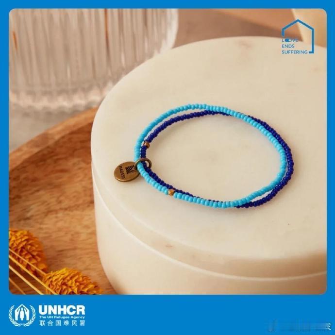 文淇的蓝色手链 文淇巴黎大秀的蓝色手链藏着温柔力量!这抹蓝出自流离失所的难民女性工匠之手,她们中多是单亲母亲与护理员,蓝色更是爱与希望的美好象征~文淇手链由难民女性工匠亲手制作