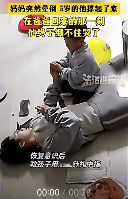 泪目了!山东一女子在家突然晕倒了!5岁的孩子超冷静的给爸爸打电话,给妈妈掐人中,全程沉稳镇定,但是却在爸爸进门的一瞬间大哭出声! 小家伙听到客厅传来的声音出来看到躺在地上的妈妈心里又怕又疼,眼泪在眼眶里打转。 尽管很害怕却没敢哭出声,急忙跑到妈妈身边,小小的身子跪在地上,紧紧抱住妈妈的腰。 男孩嘴里小声喊着:“妈妈,妈妈你怎么了?” 过了一会儿,妈妈慢慢缓过一点气,有气无力地看着儿子,声音虚弱得像蚊子叫:“给爸爸…打电话…” 孩子立马打电话给爸爸,一接通,他带着哭腔却很着急地喊:“爸,爸爸!妈妈晕倒了!你快回来!” 听到爸爸说“马上就到”,孩子悬着的心稍微放下一点。 转头又赶紧低头盯着妈妈,小手轻轻拍着妈妈的胳膊,生怕妈妈再出什么事。 妈妈意识稍微清醒了些,又吃力地握着孩子手掐自己人中! 孩子认真地照着,小手用力却又小心翼翼。 等妈妈稍微恢复点意识,又指引他拿来刺血针扎了中指。 这一系列操作下来,小家伙始终强忍着害怕,有条不紊地完成。 直到爸爸气喘吁吁地推门进来,一直憋着劲儿的小男孩再也忍不住了,“哇”地一声放声大哭,委屈又后怕的模样,让人心疼又感动。 都说“穷养富养,不如教养”,这个5岁的孩子用行动证明,父母平日里的叮嘱和言传身教,在关键时刻能成为守护家人的力量。 这一幕,真的哭死!