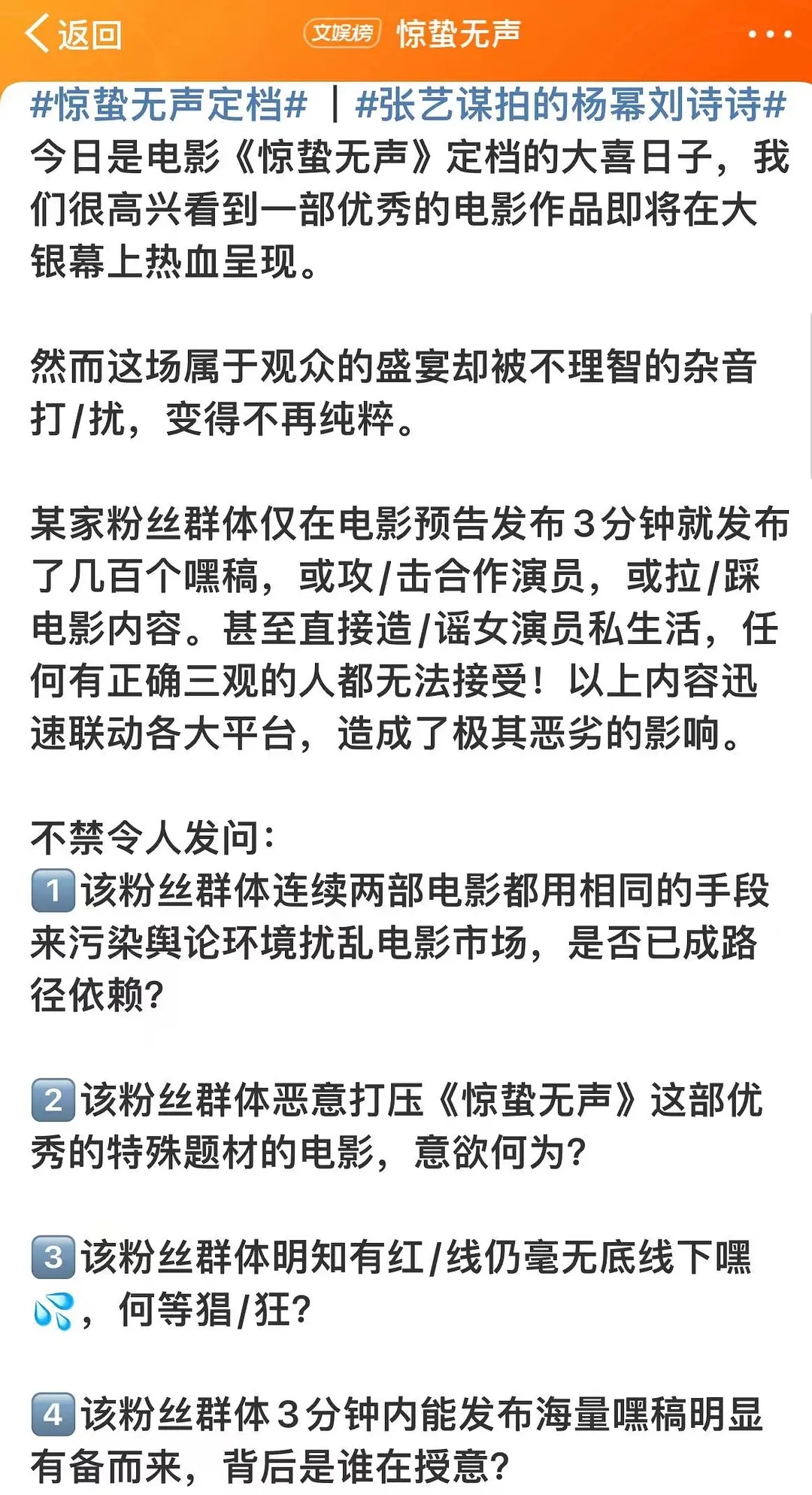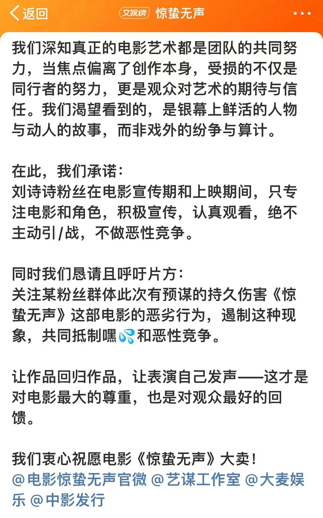 刘诗诗职能站发布关于《惊蛰无声》倡议书:承诺电影宣传和上映期间,只专注电影和角色,积极宣传,认真观看,不主动引战,不做恶性竞争。