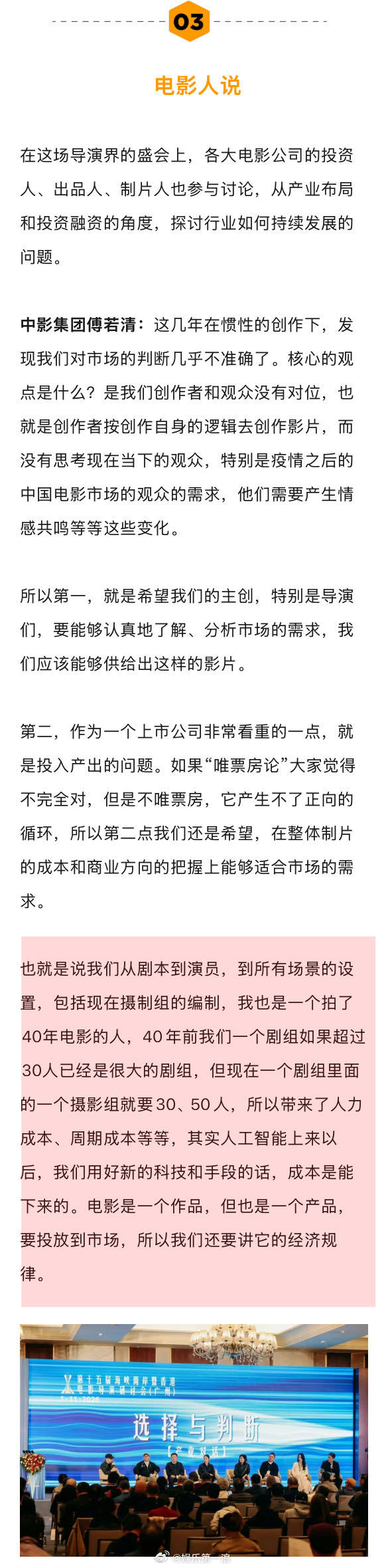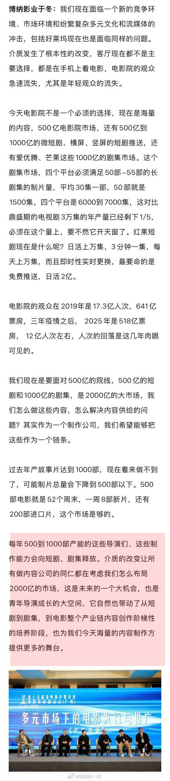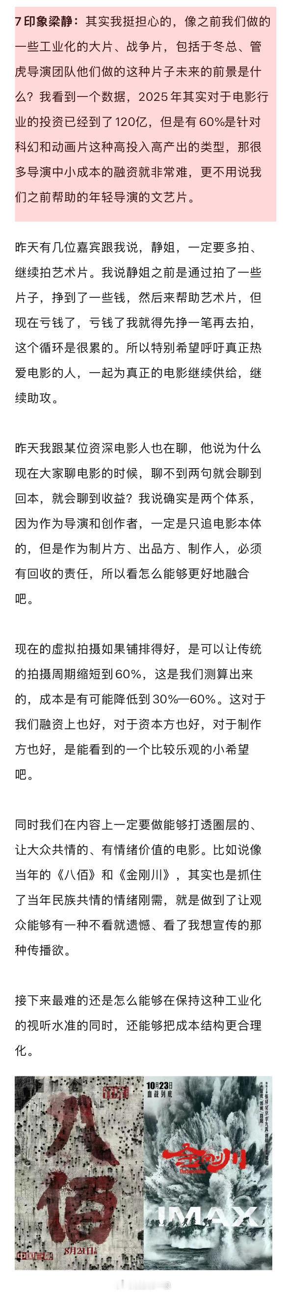 王宝强说电影失败是导演的问题 华策说寻秦记的票房超出预期 在第15届海峡两岸暨香港电影导演研讨会上,7印象梁静谈到了自己的担心:“像之前我们做的一些工业化的大片、战争片,包括于冬总、管虎导演团队他们做的这种片子未来的前景是什么?我看到一个数据,2025年其实对于电影行业的投资已经到了120亿,但是有60%是针对科幻和动画片这种高投入高产出的类型,那很多导演中小成本的融资就非常难…”娱理独家↓