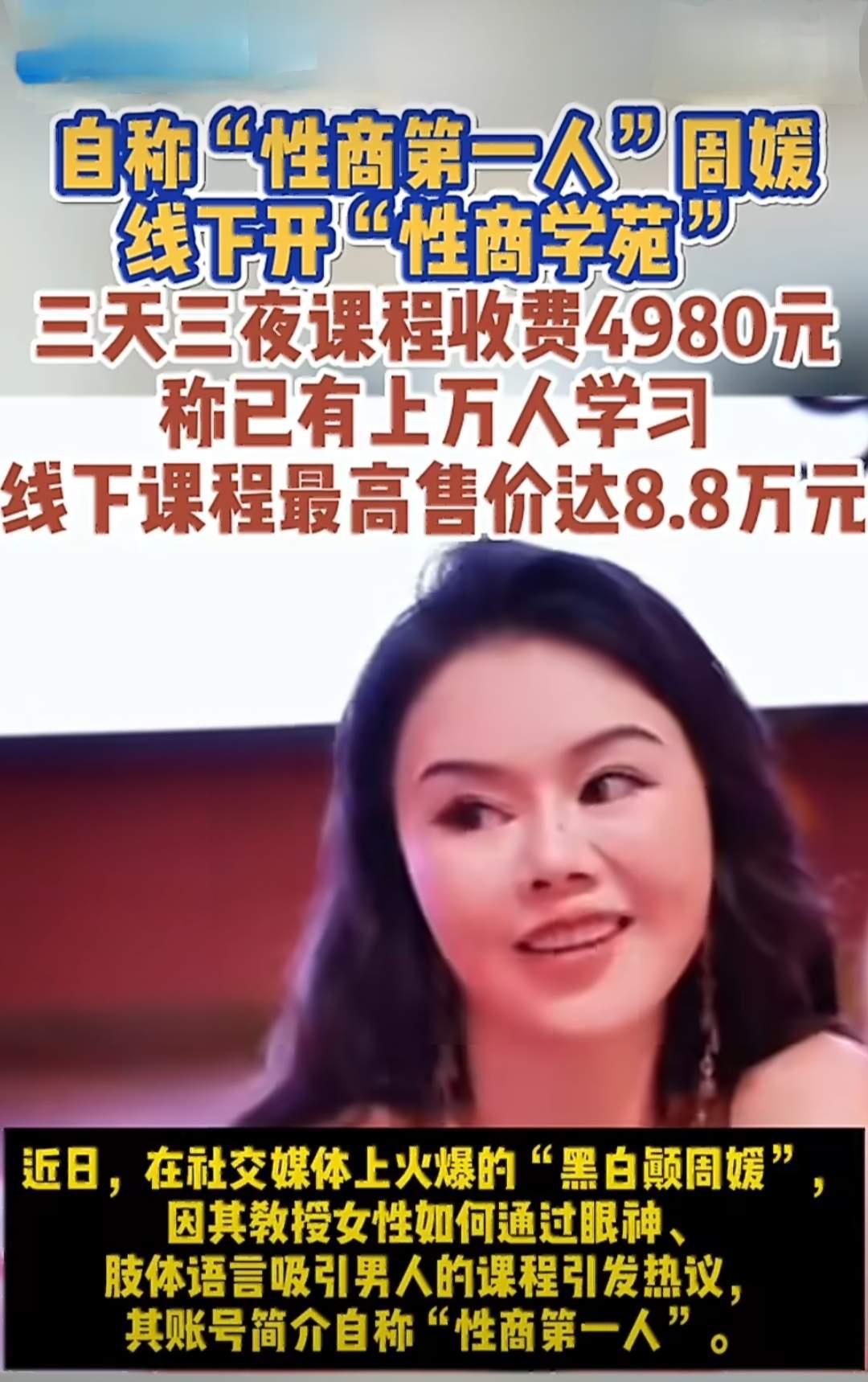 “性商教母”教女性如何用眼神肢体吸引男人,线下课最贵达到了88000。 相信最近很多都被某音上的周媛教的眼神所吸引,最近她可是爆火,教大家如何用眼神来吸引男人,她自称自己是“性商第一人”,自己在线下的“性商学院”已经开设多年,学员人数在10万以上,收入超过2400万,真不敢想到底是什么人在跟着她学习。 早在之前就听说过很多名媛培训班学习如何打入富商圈,不知道是不是同一个概念,但是这个班能维持这么久一定有她的道理,一般人也根本没有能力去学习,因为课程从2999两天两夜训练营,她最贵的一节课达到了88000,每个月开11场,每一场都是爆满的状态,相信最近大家都看过某音,她教的大家如何用眼神来勾引。 她的课程也是非常的大胆露骨,不知道到底是什么人在学习,真是让人瞠目结舌。勾引术 性商课程 性商老师