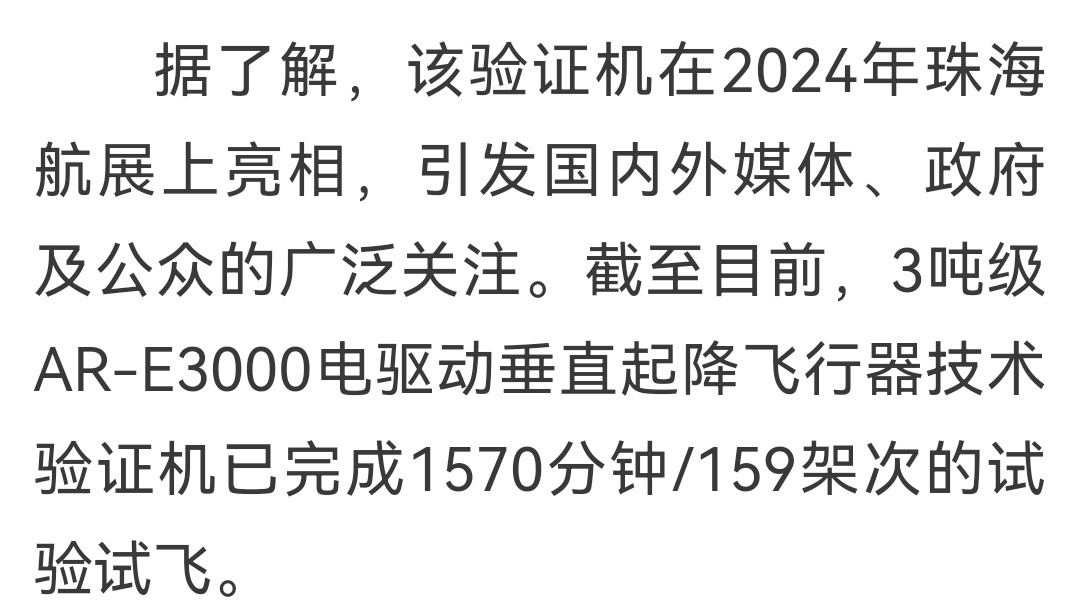 航空工业直升机所研制的3吨级AR-E3000电驱动垂直起降飞行器技术验证机已于2025年7月成功实现首飞。该机型采用倾转旋翼设计,具备低噪声和环保特性,主要为未来城市空中交通和航空物流场景做准备。该验证机在2024年珠海航展上首次亮相,截至目前,验证机已完成1570分钟/159架次的试验试飞。