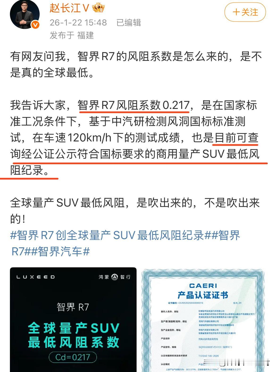 特斯拉model Y L的风阻系数是0.216。 但是呢,有“小字”。 小字部分说是:企业测得数据。 讲道理,按照现在对待小米的标准,这么小的“小字”应该要批评。 都要放大才能看得清了…… 还有就是,特斯拉这个0.216由于是企业测得数据,没有说经过第三方认证,所以不好与其他数据直接拿来对比。 赵长江说智界R7的0.217是“目前可查询经过公证公示符合国标要求的商用量产SUV最低风阻记录”,完全没问题,甚至可以说是很严谨了。 不知道特斯拉有没有兴趣model Y L拿去中汽研也吹一吹,实证一下0.216。 不过,想想好像也没太大必要…… 因为model Y L的销量已经在那了。