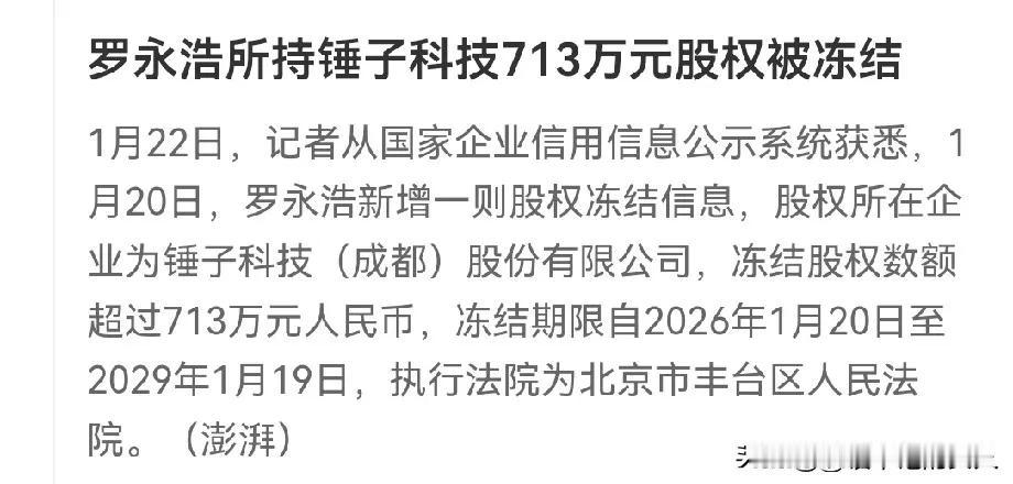 突发![捂脸] 罗永浩713万股权被冻结! 有人懂,是咋回事吗?难道还缺钱?[比心]