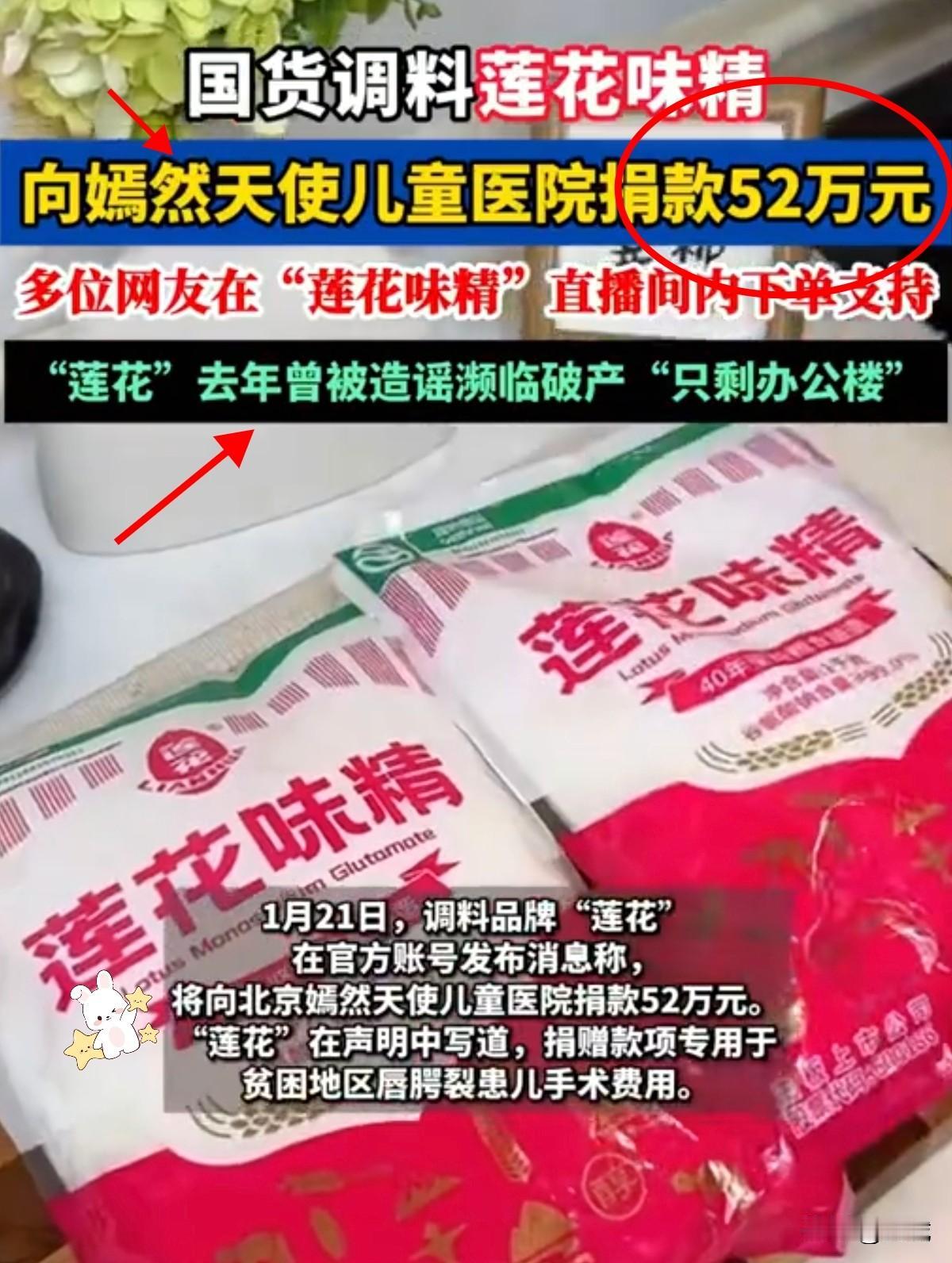 你敢信?有人捐3000万我没眨眼,有人捐100万我只当寻常,偏偏3块钱一袋的莲花味精捐52万,让我对着手机沉默! 这可是陪我们长大的老国货啊!炒菜、炖菜都离不开它,单袋才3块钱,52万得卖17.3万袋才能攒下——是千万家庭灶台边一勺勺抠出的微薄利润,是工厂工人不分昼夜一铲铲熬煮的真心。 谁能想到,曾年销12万吨、占全国43.4%市场的“味精大王”,1998年就成了调味品行业第一股,却因2003年“味精致癌”的谣言一落千丈。哪怕联合国粮农组织认证安全,中国调味品协会多次辟谣,说谷氨酸钠是人体必需氨基酸,日常烹饪无害,它还是亏到差点停产,工人只能领基本生活费。 可它从没辩解,更没涨价,3块钱的定价守了几十年,用料半点不掺假。2025年刚靠创新产品实现43.15%净利润增长,刚熬出头就把底气捐给了嫣然儿童医院。 世人总觉得捐款是有钱人的事,可偏偏是这种受了半辈子误解、刚缓过来的老国货,最懂倾囊相助的重量。试想被诋毁二十年,刚有起色就捐出辛苦钱,换谁能不犹豫?但莲花做到了! 善意从无高低,厚道无关身家。自己难的时候还想着帮人,才是最珍贵的人间烟火气。这52万,是老国货刻在骨子里的担当,比千万巨款更戳心! 我真的被这老国货感动到了[流泪],你们家里是不是也常年备着莲花味精?