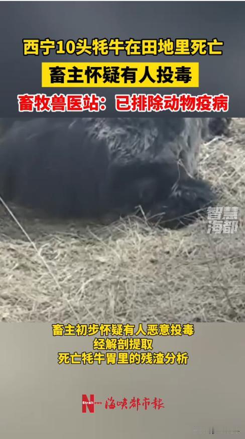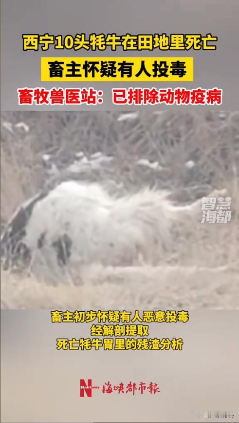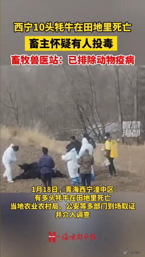 “严查到底!”近日,青海西宁,一名牧民养殖户清晨去田里查看时,竟发现自家放养的10头壮硕牦牛竟集体倒在田地里没了气息,口鼻还残留着异常分泌物。畜主心疼得直掉眼泪,怀疑有人恶意投毒,于是赶紧报警!网友:得罪谁了? 很多牧民家里都会养殖牦牛,一头成年牦牛价值上万,不仅能产奶、做酥油支撑着全家日常生计,更是牧民家里的救命钱。因此一夜之间损失10头牦牛,对普通牧民来说,简直是天塌下来的打击。 据媒体1月19日报道,男子家里养了十几头牦牛,长期以来一直是在田间散养着。多年来,一家人一直靠养牦牛维持生计。这天清晨,男子像往常一样去田里查看牦牛,可却发现10头牦牛全都倒在地上没了气息,甚至身体僵硬,口鼻处还有异常分泌物。这让他瞬间慌了神,赶紧联系了当地畜牧兽医站和警方。 畜牧兽医站工作人员到场后,对牦牛进行了初步检测,已排除动物疫病导致死亡的可能,这让畜主更加怀疑是有人投毒报复。目前当地公安、农业等多部门已到场取证,介入调查具体原因。 网友看后纷纷表示,10头牦牛对牧民来说是天大的损失,必须查出真凶!有人猜测,会不会是邻里矛盾引发的报复行为?还有人呼吁,尽快查清真相,给养殖户一个交代! 信息来源:《西宁10头牦牛在田地里死亡,畜主怀疑有人投毒,畜牧兽医站:已排除动物疫病》海峡都市報
