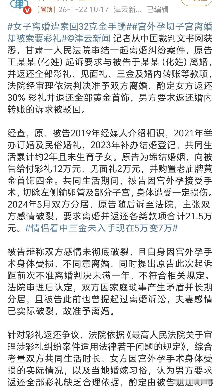 看到一个离婚案子,看完后,不禁让人发问,婚姻究竟能给双方带来什么? 这个家庭纠纷中,俩人19年相识,21年举办婚礼,23年领证。 两年多的共同生活里,女方因为宫外孕,导致输卵管和部分子宫被切除了,身体受了那么大罪不说,结果没多久,男方起诉离婚,理由是感情破裂。 接着就是算账,12万彩礼、2万见面礼、四金首饰,甚至连婚内转的钱都想要回去。 考虑到双方的情况,法院最后判女方只退30%彩礼和首饰,婚内转账不用还。 感觉这门婚姻像做生意一样,不满意就全额退款。 宫外孕让女子的身体留了永久的伤痕,而对方在斤斤计较自己的投资回报率。 好的婚姻是共担风雨,而不是在对方最脆弱的时候,再补一刀。 结没结对婚,生次病就知道了,有的人只能同甘,不能共苦。