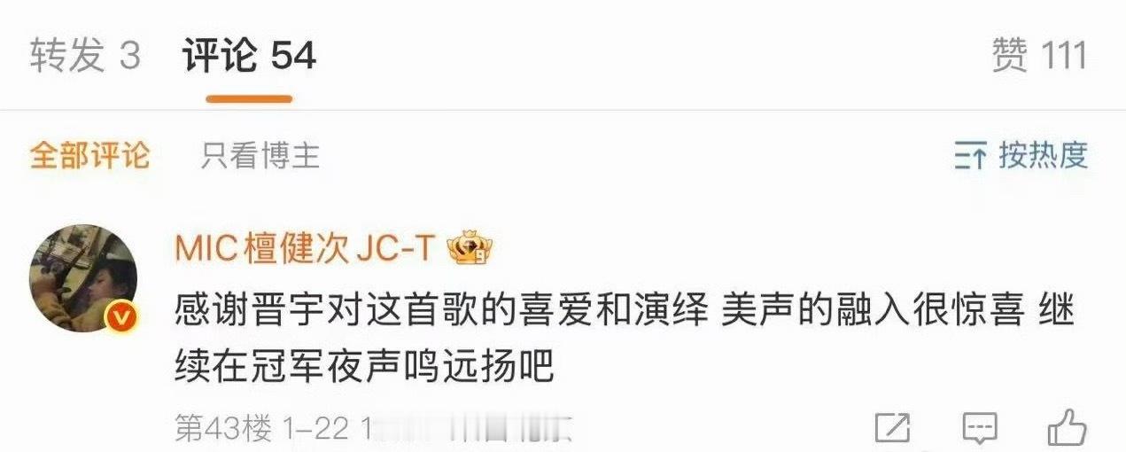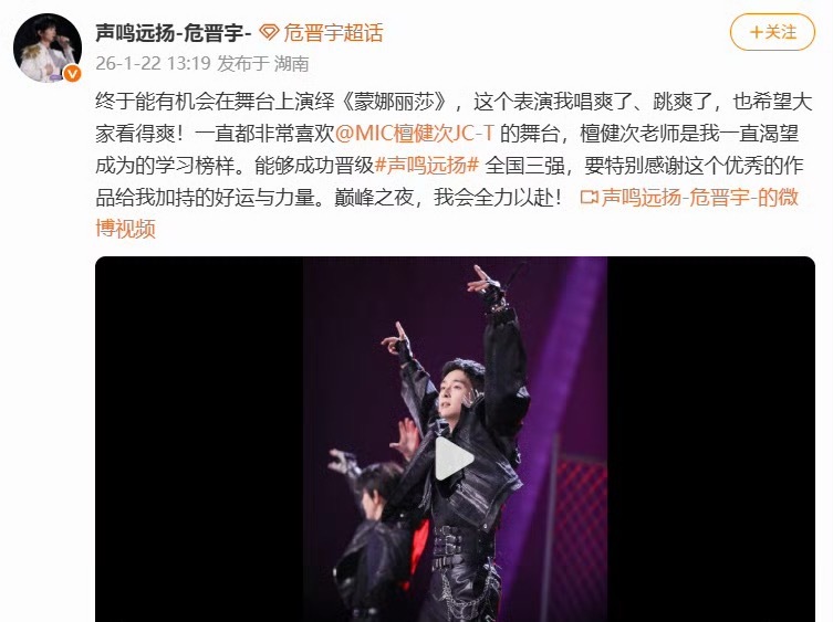 檀健次给危晋宇冠军夜加油檀健次:“感谢晋宇对这首歌的喜爱和演绎,美声的融入很惊喜,继续在冠军夜声鸣远扬吧!”👏声鸣远扬