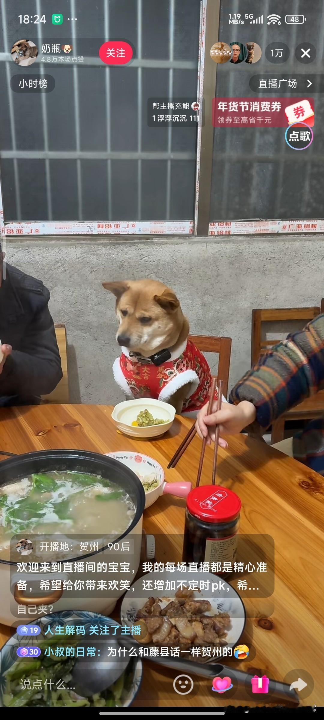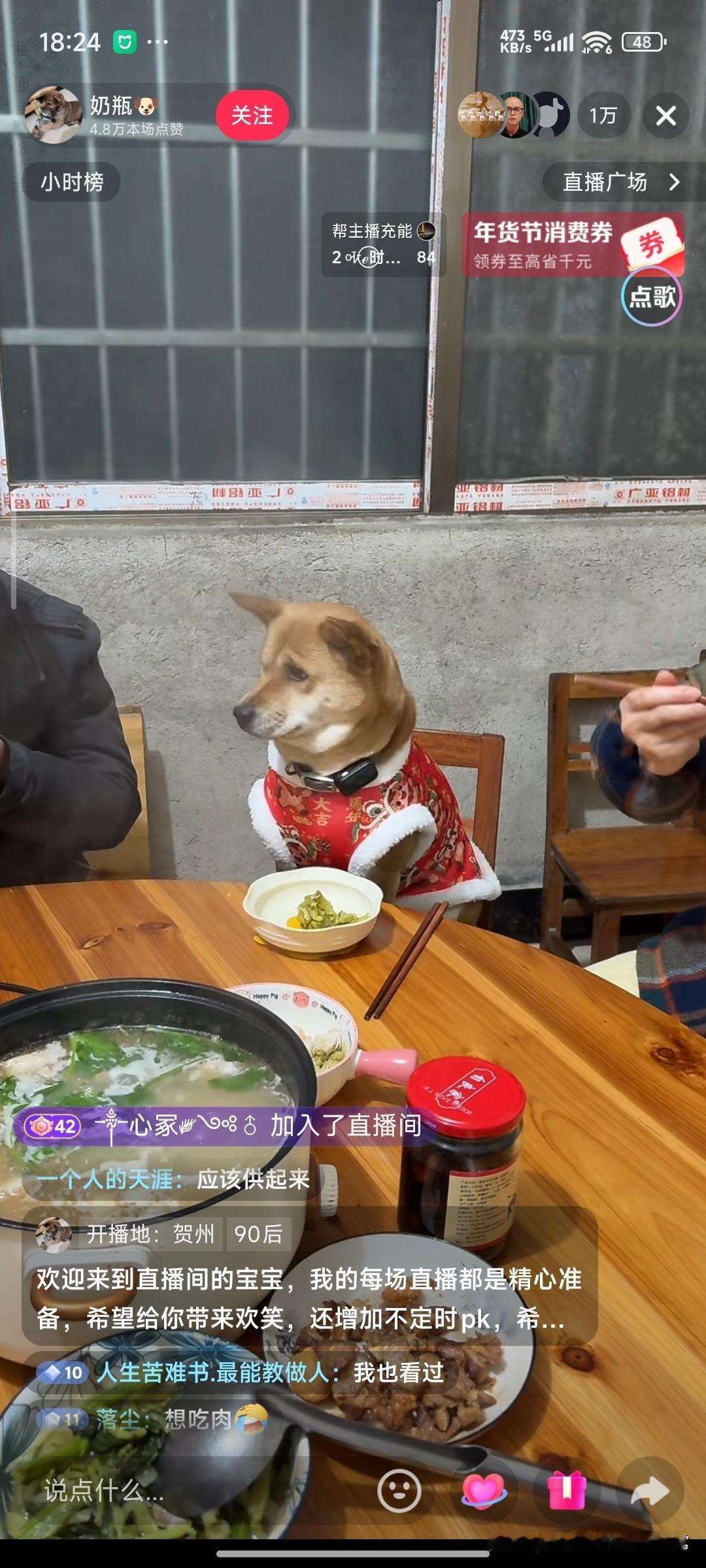 这只狗可以上桌子吃饭,网友吵翻了! 广西贺州的这场直播,主角不是网红,而是一只穿着红肚兜的土狗。它正襟危坐在木椅上,面前摆着专属饭碗,跟主人同桌喝汤吃肉,直播间里挤进来上万观众,都在为这只“狗生赢家”疯狂点赞。 有人笑称:“我活了几十年,还不如一只狗有排面!”还有人回忆起自家狗狗只能蹲在桌下等投喂的日子,满是羡慕。但也有网友直接开喷:“狗上桌成何体统?这是没规矩!”更有人质疑,这是博主为了博眼球无底线炒作。 其实在很多广西农村,土狗本就是家庭一员,冬天围炉吃饭时,狗狗凑过来蹭口热汤再平常不过。可当这份日常被搬上直播,就成了“毁三观”和“接地气”的争议现场。 你家的狗狗能上桌吃饭吗?这种把宠物当家人的相处方式,到底是暖心还是没规矩?