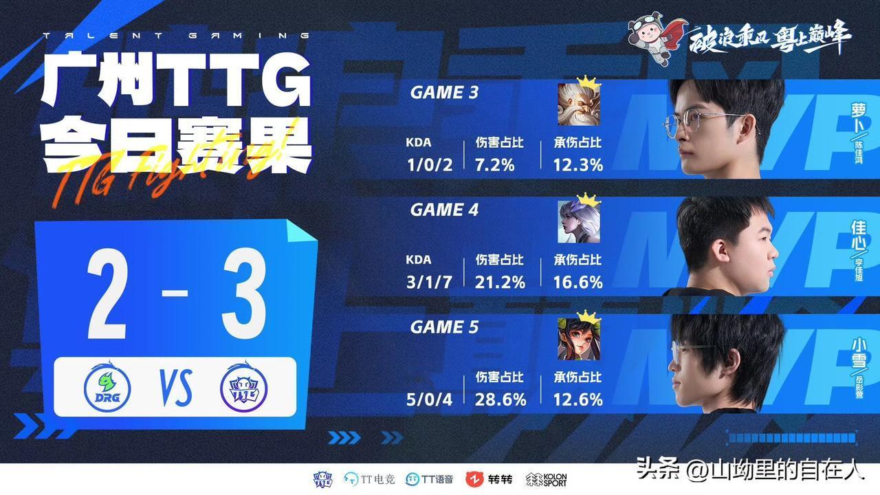 1月22日KPL春季赛第二周,广州TTG 3-2佛山DRG,在0-2落后下连扳三局完成让二追三,拿下春季赛两连胜,打破此前被DRG BO7压制的心理阴影。 赛果:TTG 3-2 DRG(比分:0-1→0-2→1-2→2-2→3-2) 对抗路萝卜(老夫子/夏洛特节奏拉满)、打野佳心(镜切C逆转)、射手小雪(孙尚香后期接管) 第三局萝卜老夫子连续捆杀朵莉亚控节奏;第四局佳心镜前期零换二滚雪球 - 决胜局:TTG拿孙尚香+西施+太乙+夏侯惇+夏洛特,保C体系成型,10分钟孙尚香对位领先近3000经济,平推取胜 DRG前期入侵野区,拿双龙持续掉点,经济压制速推 DRG抓鲁班大师失误拿主宰,连环追击11分钟锁胜,拿到赛点 TTG康特选老夫子,萝卜三捆朵莉亚控节奏,多前排压制DRG,扳回一局 佳心镜河道零换二,切C制造掉点,拿暴君破中路高地,15分钟终结比赛 TTG选“真香保C阵容”,夏洛特防关羽绕后,孙尚香持续输出平推 后三局选多前排+强开团,第三局5楼康特老夫子成关键 萝卜老夫子锁DRG辅助,佳心镜前期入侵+切C,中野辅联动拉满 决胜局保C体系严密,视野压制DRG,避免前期掉点 0-2后不慌,每局针对性调整,执行力拉满 两连胜巩固排名,打破DRG心理魔咒,萝卜、佳心等选手证明实力 前期强但中期决策/节奏易断,需优化团战协同与后期运营