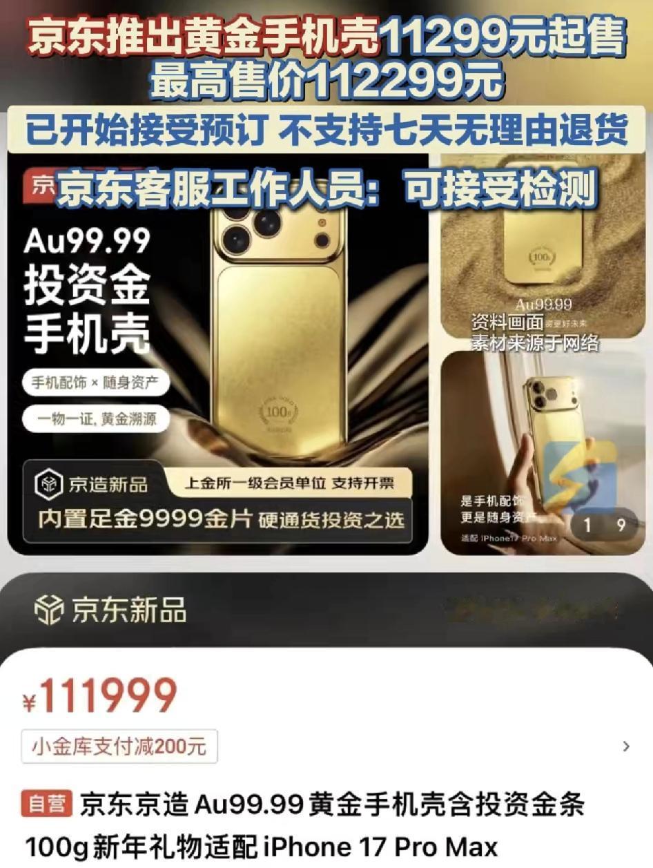 京东平台推出黄金手机壳,最低价格是11,299元,最高价格是112,299元,分别是10克,20克、30克和50克,目前仅适配于iPhone17 Pro max。但是这款产品不支持7天无理由退货,如果消费者对商品有异议的,可以到国家认定的任何环境检测机构去验货。对于消费者来说,更多的就是拿来收藏,估计没有人愿意拿着这么贵重的物品当做是手机壳来去日常使用。