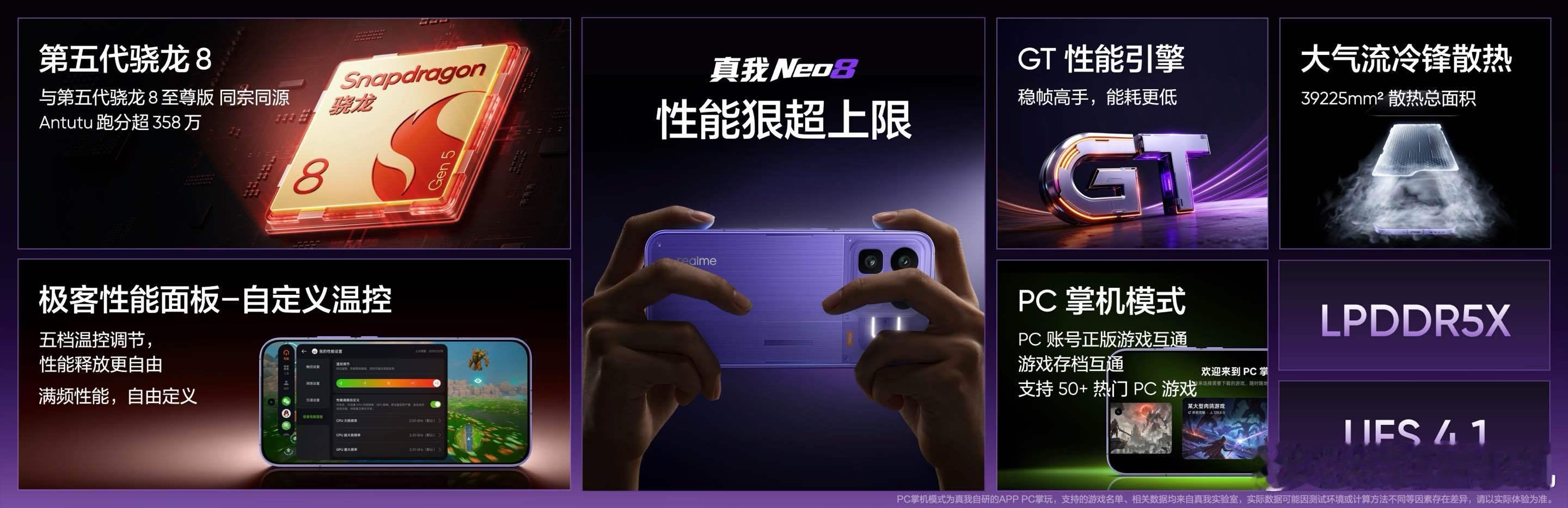 真我Neo8第五代骁龙8×极客性能面板×GT性能引擎全面加持,开启高阶性能释放;并带来PC掌机模式,手游+PC游戏真我Neo8一机满足!【第五代骁龙8旗舰芯,领衔顶级硬件】-第五代骁龙8采用第五代骁龙8至尊版同款旗舰架构与3nm先进制程工艺,350W+跑分天生即旗舰-大气流冷锋散热系统,散热总面积高达39225mm²,解锁真我最强散热-苍穹通信系统×穹通信芯片S1,弱网游戏也能快人一步【新一代GT性能引擎,激发系统级调校】-凭借先知能效调度、定制游戏专属性能核心、超级帧率算法等,性能拉满调校领先-主流枪战手游165帧无限满帧,国民级MOBA手游144帧无限满帧,大型开放世界手游60帧跑图2小时满帧【新一代极客性能面板,开启高阶自定义】-不仅支持自定义CPU与GPU运行频率,更无需ROOT即可打破温控上限,将性能自由还给用户-新增自定义温控调节支持五档温控调节,档位越高性能释放越强, 想保守还是激进由你定义【PC掌机模式,手机秒变Steam掌机】-Steam账号登陆,保障已购正版游戏互通,并支持游戏存档全平台互通。现已验证适配50+款热门PC游戏,支持《空洞骑士:丝之歌》《哈迪斯2》《古墓丽影9》等游戏流畅运行,并适配游戏手柄操作-户外露营、宿舍床上、飞机高铁等差旅通勤,随时随地开启掌上电竞房体验,将正版Steam庞大游戏库装进口袋,一键启动嗨玩到底