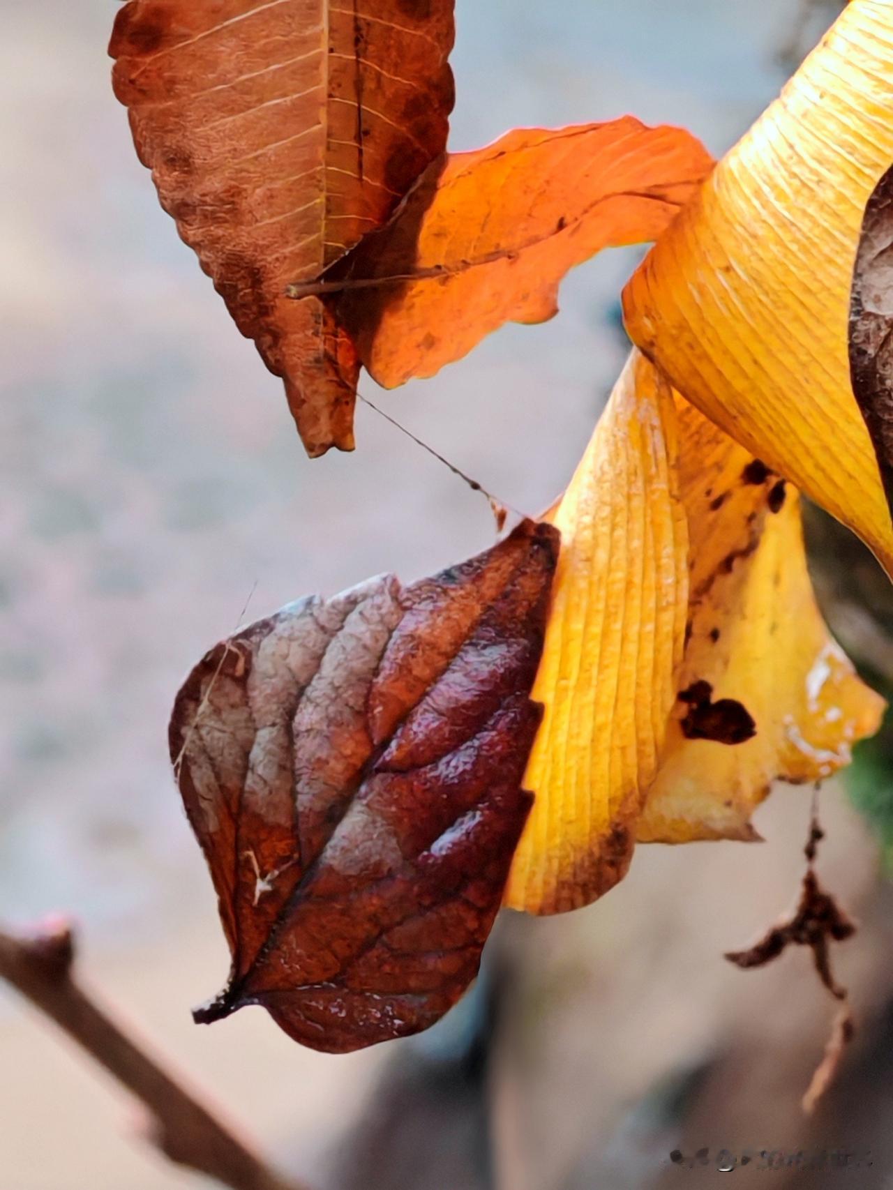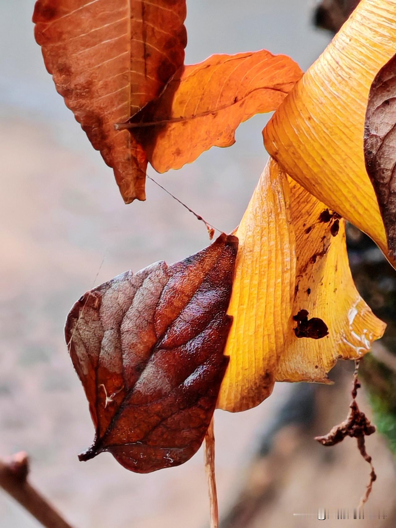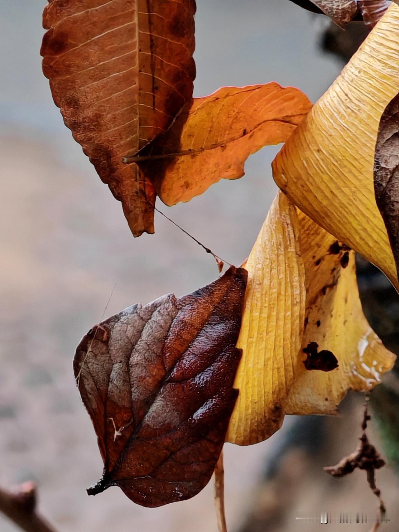 秋叶在冬天的寒风里飘零,岁月静好。 在这静谧的冬日里,我在社区公园里发现那残存的秋色宛如一幅被时光晕染的画卷。金黄的银杏叶,像一只只轻盈的蝴蝶,在空中悠悠地打着旋儿。 我手中的手机不停捕捉着这美好的瞬间。雨水洗净了枯叶上的灰尘焕发出秋叶的斑斓,构成了一幅绝美的画面。仿佛还在诉说着对秋天的故事。偶尔有一阵微风吹过,枯叶晃一晃,像是在轻声吟唱着岁月的歌谣。仿佛能看到时光在它身上留下的痕迹。冬有秋色,这是大自然给予我们的馈赠。在这岁月静好的时光里,用手机记录下这些美丽的瞬间,让这份美好永远定格。