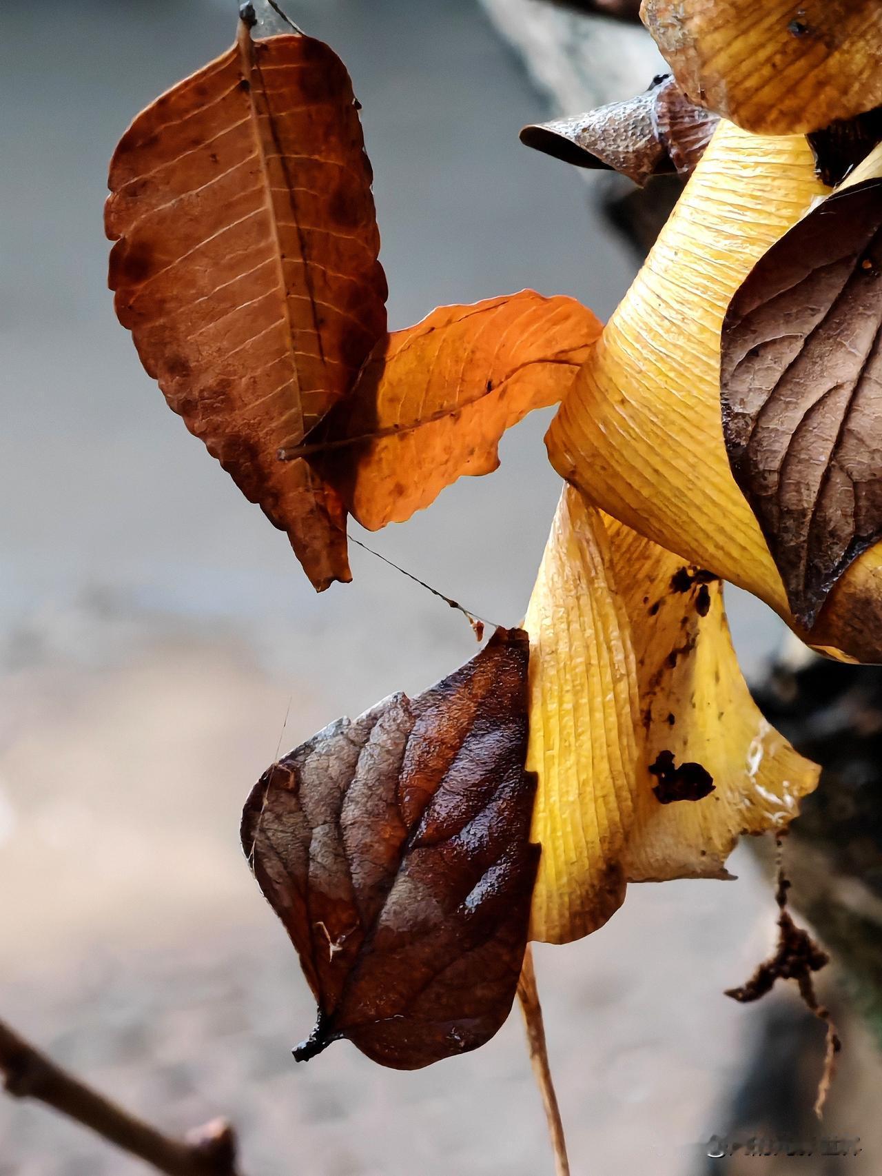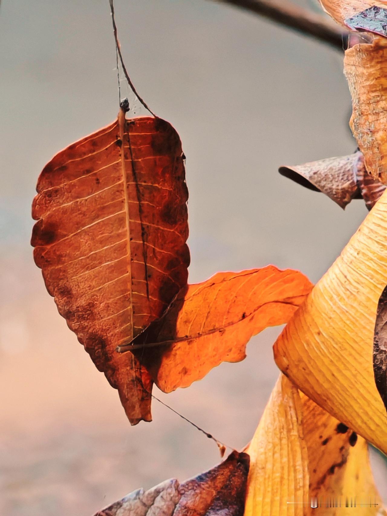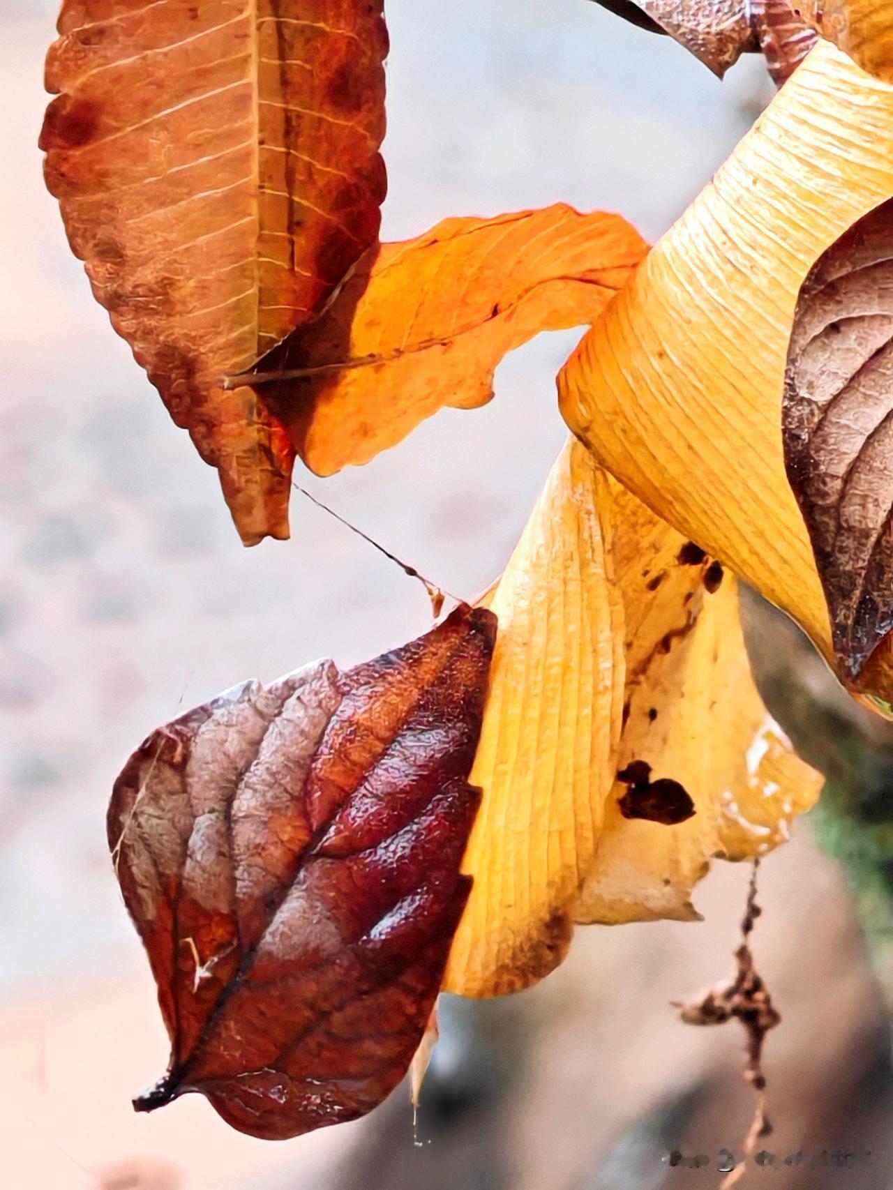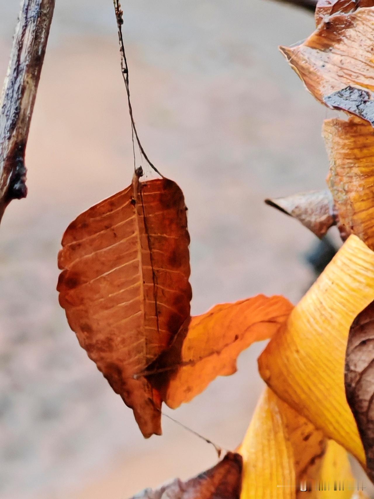秋叶在冬天的寒风里飘零,岁月静好。 在这静谧的冬日里,我在社区公园里发现那残存的秋色宛如一幅被时光晕染的画卷。金黄的银杏叶,像一只只轻盈的蝴蝶,在空中悠悠地打着旋儿。 我手中的手机不停捕捉着这美好的瞬间。雨水洗净了枯叶上的灰尘焕发出秋叶的斑斓,构成了一幅绝美的画面。仿佛还在诉说着对秋天的故事。偶尔有一阵微风吹过,枯叶晃一晃,像是在轻声吟唱着岁月的歌谣。仿佛能看到时光在它身上留下的痕迹。冬有秋色,这是大自然给予我们的馈赠。在这岁月静好的时光里,用手机记录下这些美丽的瞬间,让这份美好永远定格。