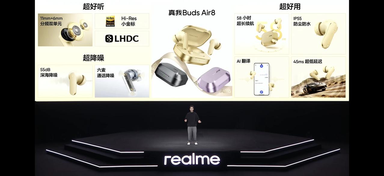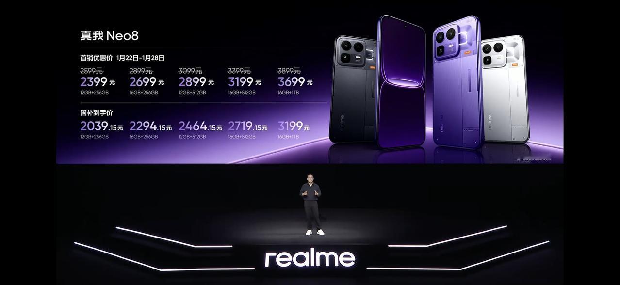 《一条带你看完真我Neo8》 -骁龙8 Gen5,LPDDR5X+UFS4.1,⼤⽓流冷锋散热系统,极客性能面板。 -8000毫安时大电池+80W,全协议栈充电UFCS/PPS/PD/QC,旁路充电。 -6.78英⼨1.5K165Hz三星苍穹屏,三星M14发光材料,全局峰值:1800nit,103% DCI-P3,瞬时触控采样率3800Hz,360Hz十指报点率,游戏触显同步技术,3D超声波指纹。 -前置 -后置5000万主摄1/1.56,5000万潜望式长焦,3.5X光变,7X无损。 -IP66/IP68/IP69 -自研掌机模式,steam账户打通。 -使命召唤⼿游、穿越⽕线⼿游、三⻆洲⾏动、暗区突围、和平精英等19款原⽣165Hz模式;王者荣耀、⽆畏契约原⽣144Hz模式;原神、星铁120Hz+1.5K原生级超分超帧模式。 -苍穹信号芯⽚S1 -双扬声器,X轴马达,红外,NFC。 -厚8.3mm 重215g -⽩ 灰 紫 -保证4年系统维护 3个安卓大版本更新 享受OPPO售后服务 -2399起步(12+256国步后2039起) 同时带来了不到300块的真我Buds Air8:11mm+6mm分频双单元,55dB降噪。