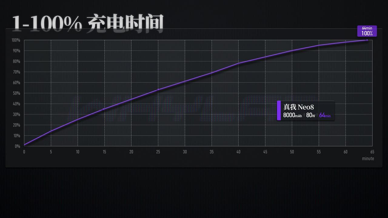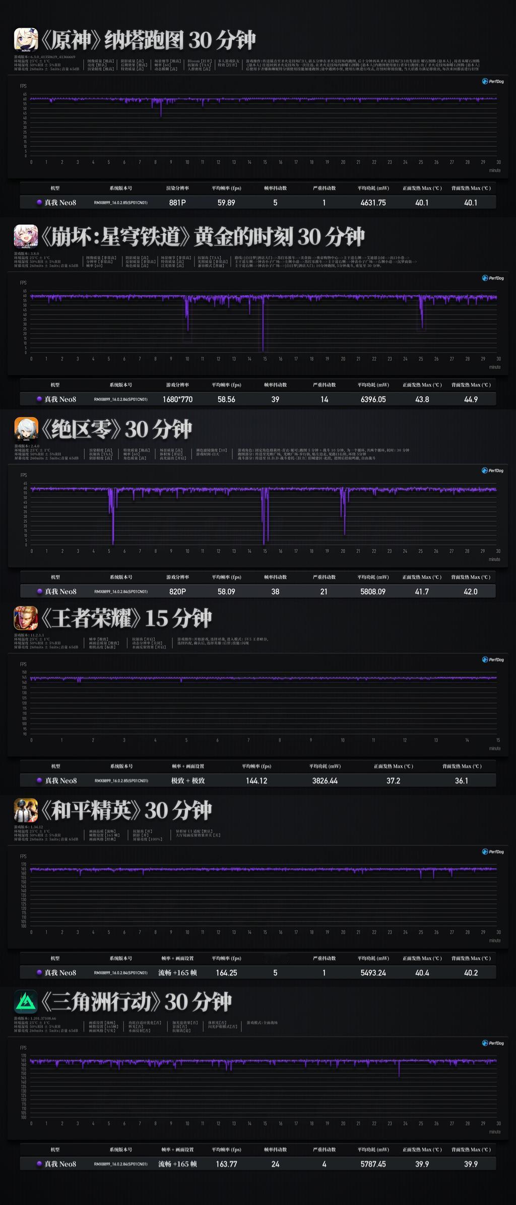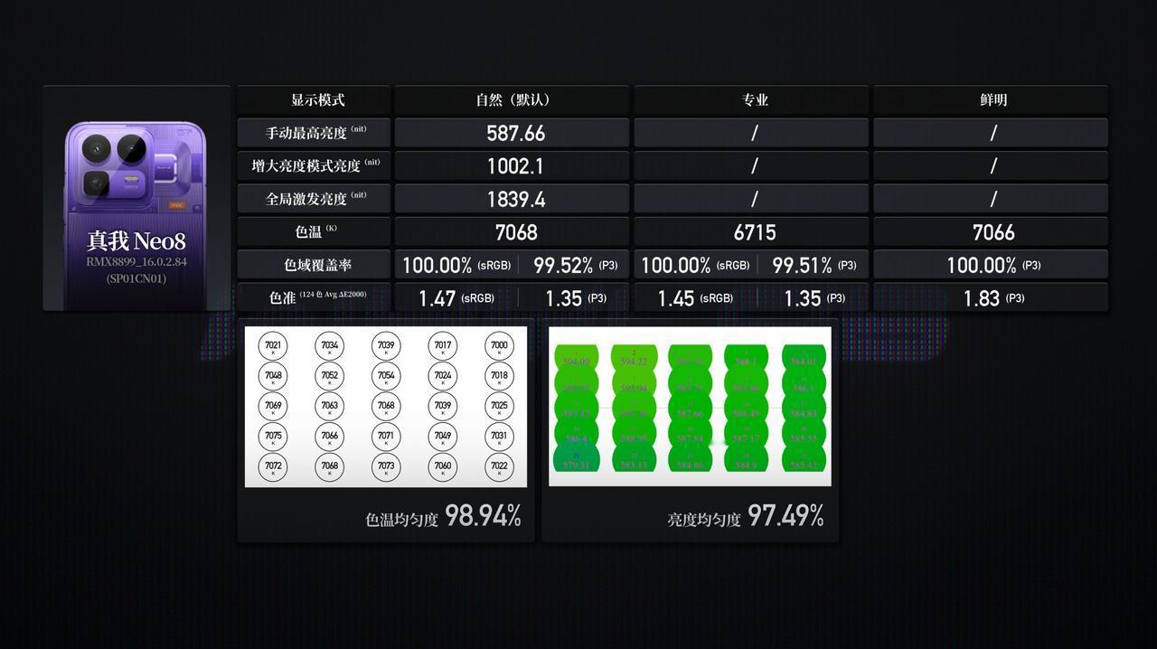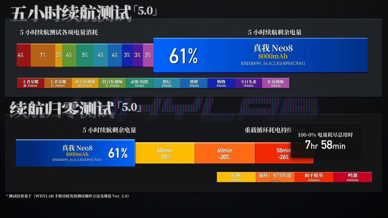 新增真我 Neo8 测试数据,真我 Neo8 的相机详细数据以及更多新机的测试数据可以访问小程序「WHYLAB」,进行查看。 ➢ 🎮 游戏:《王者荣耀》开启极致画质+极致帧率设置,15 分钟一局对战帧率稳定,平均帧率 144.12fps,平均功耗 3826.44mW,正面最高温度 37.2℃、背面36.1℃,握持感温热不烫手; 《和平精英》设置为流畅画质+ 165 帧模式,30 分钟测试平均帧率 164.25fps,总抖动数 5 次、严重抖动数 1 次,平均功耗 5493.24mW,正反面最高温度分别为 40.4℃、40.2℃,全程贴帧运行,温控表现稳定; 《三角洲行动》同样开启流畅画质+165 帧模式,30 分钟平均帧率 163.77fps,总抖动数 24 次、严重抖动数 4 次,平均功耗 5787.45mW,正反面最高温度均为 39.9℃,激烈对战时帧率波动可控,散热表现均衡; 《原神》纳塔 881P 分辨率下测试 30 分钟,帧率接近满帧运行,平均 59.89fps,总抖动数 5 次、严重抖动数 1 次,平均功耗 4631.75mW,正反面最高温度均为 40.1℃,全程无明显降频,温控表现优异; 高负载的《绝区零》820P 分辨率模式下,30 分钟平均帧率 58.09fps,总抖动数 38 次、严重抖动数 21 次,平均功耗 5808.09mW,正面最高温度 41.7℃、背面 42℃,配合 39225mm² 大气流冷锋散热系统,高温区域集中在中框,无明显烫手感,表现优于同价位机型; 继续上压力,测试《崩坏·星穹铁道》黄金的时刻 1680×770 渲染分辨率,30 分钟平均帧率 58.56fps,总抖动数 39 次、严重抖动数 14 次,平均功耗 6396.05mW,正面最高温度 43.8℃、背面 44.9℃,依托单层主板设计,热量散出迅速,整体流畅度不受影响; ➢ 📱 屏幕:采用一块 6.78 英寸三星显示 M14 OLED 面板,分辨率 2772×1272,属于旗舰级面板配置。实测数据表现亮眼:自然(默认)模式下手动最高亮度 587.66nits,增大亮度模式亮度为 1002.10nits,全局激发亮度 1839.40nits,25% 窗口激发亮度更是高达 3599.50nits,户外强光下内容清晰可见;亮度均匀度 97.49%,整体无明显偏暗区域,画面明暗层次极致通透。 色温与色准方面,色温均匀度 98.94%,色温范围 6150~7770K,自然(默认)模式 CCT 为7068K,偏冷色温观感;sRGB 124 色 Avg ΔE2000在自然模式下 1.47、专业模式 1.45,色准表现出色,sRGB 覆盖率双模式均达 100.00%;P3 124 色 Avg ΔE2000 自然与专业模式均为 1.35、鲜明模式 1.83,P3 覆盖率自然模式 99.52%、专业模式 99.51%、鲜明模式 100.00%,色彩还原精准度拉满。 护眼与基础参数上,蓝光峰值波长 458nm,默认模式下护眼蓝光占比 17.67%,最冷模式 27.71%,最暖模式仅 6.78%,兼顾观感与护眼;SVM 平均值 0.41,护眼表现加分,整体屏幕素质领先同价位机型。 ➢ 🔋 续航:配备 8000mAh 泰坦电池,五小时综合续航测试实测,剩余 61% 电量,综合续航能力和 REDMI K90 Pro Max 相当;五小时续航测试中发热控制稳定,最高温出现在游戏场景,正面 37.1℃、背面 37.7℃,切换至短视频、社交等轻负载场景后,温度快速回落至 30℃ 左右,整体握持无明显烫手感。 继续四小时重载耗电测试(起始电量 61%),最终续航归零总时长 7 小时 58 分钟,成绩介于一加 15 与 vivo X300 Pro 之间;四小时重载发热测试中,星穹铁道场景达最高温,正面 41.6℃、背面 40.6℃,依托散热系统,温度无持续攀升,表现稳定。 ➢ ⚡️ 充电:搭配 80W SUPERVOOC 闪充,充电效率与温控表现均衡。实测 10 分钟可充电至 25%,30 分钟充电至 61%,从 1% 充至 100% 完全满电耗时 64 分钟,节奏贴合日常补能需求,无需长时间等待。 充电发热控制合理,起始正反面温度均约 25.5℃,升温集中在前期,正面最高温 40.0℃、背面最高温 43.1℃,随后逐步回落,满电时均降至 29.9℃。此外,Neo8 还提供全场景旁路充电功能,边玩边充不发热。 以上就是真我 Neo8 的实验室测试数据,2399 元的起售价相比友商同配置机型更具优势,同时在屏幕、续航、散热等方面均有越级表现,如果对性价比和全能体验有极致追求,那么真我 Neo8 会是绝佳选择。