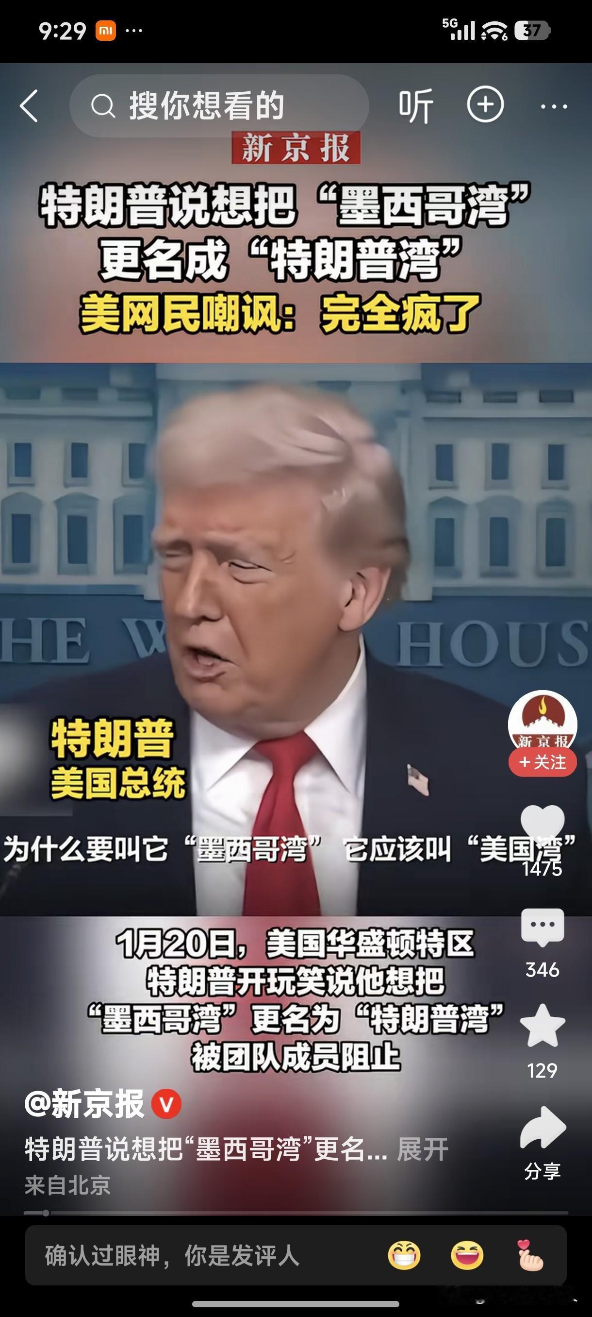 美国网民嘲讽特朗普“完全疯了”! 1月20日,美国华盛顿特区。特朗普开玩笑说他想把“墨西哥湾”更名为“特朗普湾”! 特朗普没有疯甚至比任何人更明白,他清楚的知道他在做什么。他比任何一个总统更像美国总统,他是最完美的“霸权”大玩家,最有“魄力”的政治家!