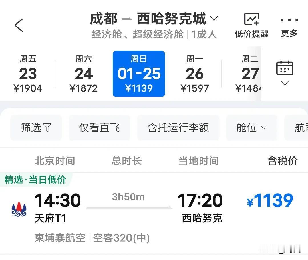快讯,成都和柬埔寨西港开通直航客机线路,仅需要1100多元就可出国旅游。1月21日,成都正式开通和柬埔寨西哈努克港直飞航线,首飞航班于时间9时许从西港起飞,航程大约4小时左右,13点左右降落到达成都天府机场。 随后航班将运送成都游客到柬埔寨,大约于14点30分从天府机场起飞,同样飞行4小时于当天17时20分返回柬埔寨西港,这标志着又一条中柬跨国直飞航线通航。目前该航线每周两班,票价在1000元左右。 柬埔寨新航线 成都开通直达柬埔寨西港的航班 成都柬埔寨西港航班每周两班
