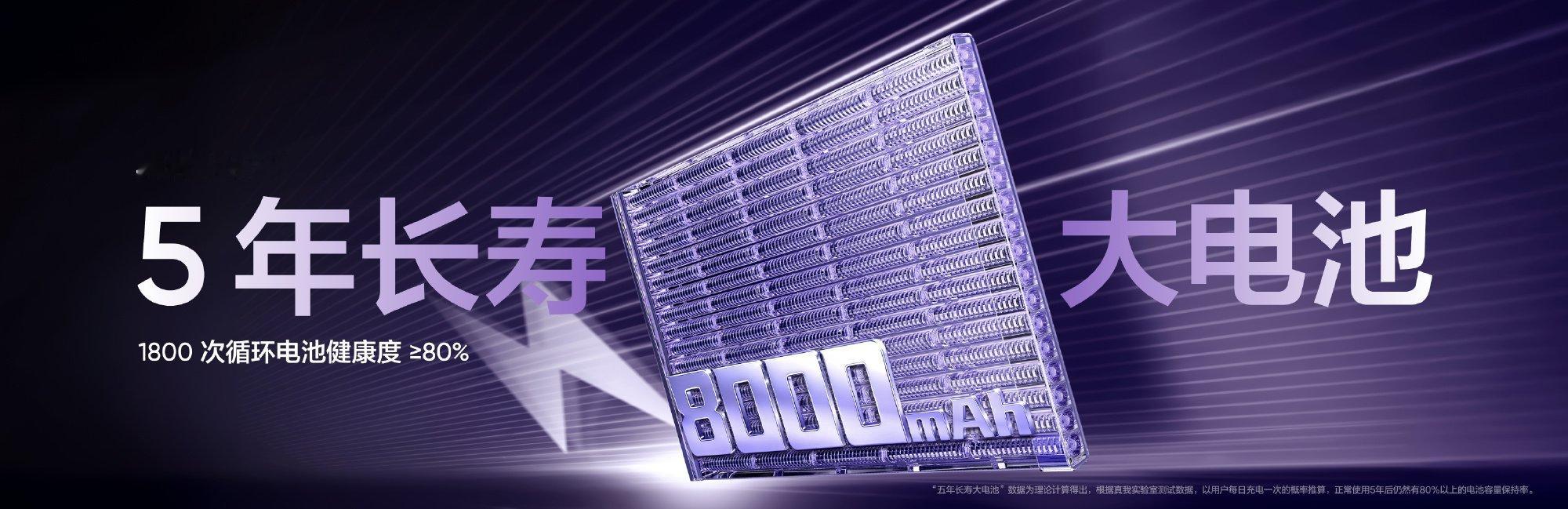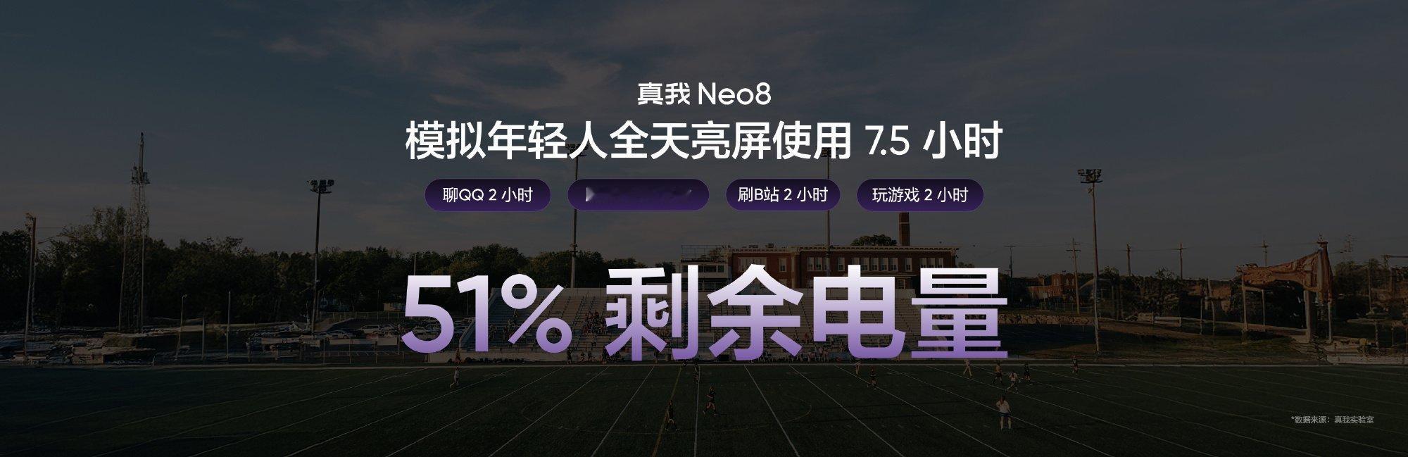 真我 Neo8 采用一块 8000mAh 泰坦电池,支持 80W 快充,全场景全协议旁路充电,今年的中端机就没有电池小的。 既要性能优先,还要续航领先!单层主板虽然散热好、性能释放狠,但留给电池的空间较少;通过提升电池能量密度,真我Neo8在使用单层主板的情况下,搭载了8000mAh的大电池。▸ 硅碳负极黑科技:含硅量提升至16%,能量密度较上代再次提升3%▸ 全天使用无忧:模拟大学生全天亮屏使用7.5小时,剩余电量51%,续航表现优秀▸ 重度游玩更久:足够连续打7.7小时MOBA手游,刷超20小时短视频▸ 全场景旁路充电:电流直接给主板供电,边玩边充,不发热、不降频▸ 支持主流协议:支持 UFCS、PPS、PD、QC 等多种主流快充协议,好充不挑头▸ 电池长寿耐用:5年长寿健康耐用,1800次循环电池健康度≥80%真我Neo8