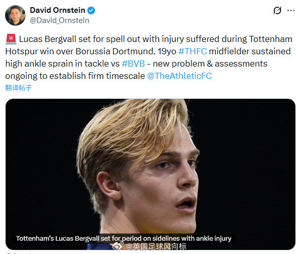 【热刺伤情加剧!贝里瓦尔长期伤停】TA名记DO:热刺中场,19岁瑞典国脚贝里瓦尔,在对阵多特蒙德的欧冠比赛中,铲球时脚踝严重扭伤,这是一次新伤,预计将缺阵一阵时间,热刺方面还在评估伤情的严重程度和复出时间。PS:理查利森、本坦库尔、库杜斯、本戴维斯、贝里瓦尔都是1月新伤号,库鲁塞夫斯基和麦迪逊是老伤号。