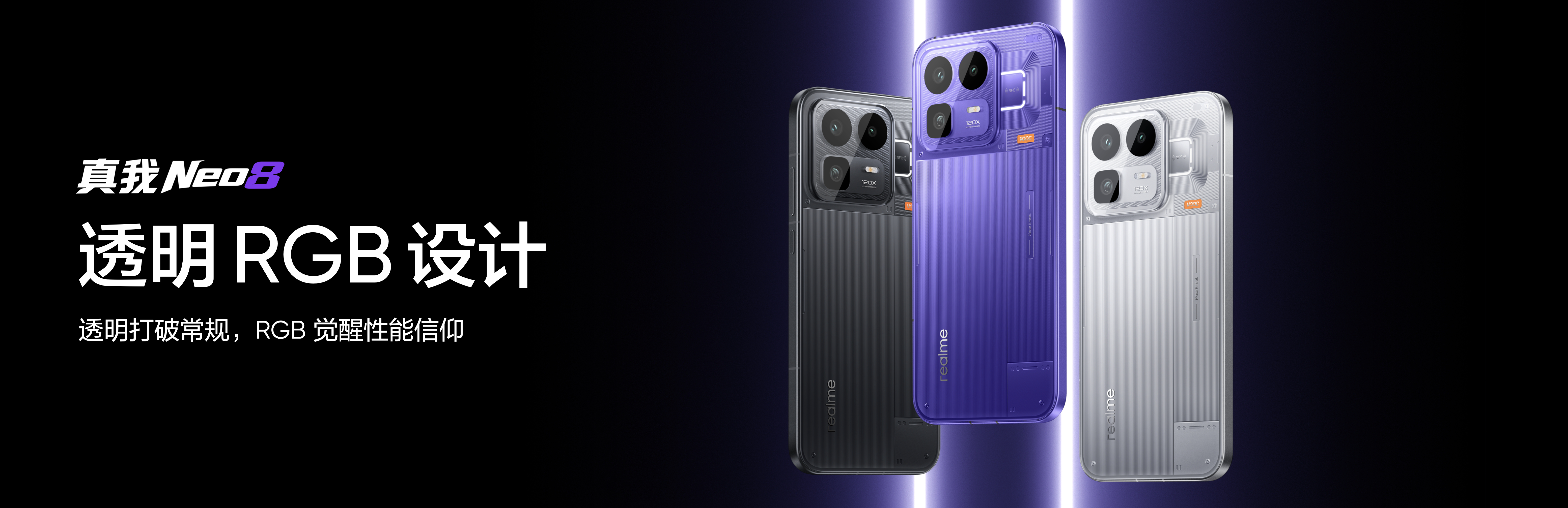 realme真我Neo8正式亮相外观材质:透明玻璃后盖 + 磨砂金属中框,正面超窄四等边设计。特色灯效:RGB 觉醒光环系统,支持游戏、通知、音乐律动及独创的“翻转幸运色”。配色:赛博紫、起源白、机甲灰。