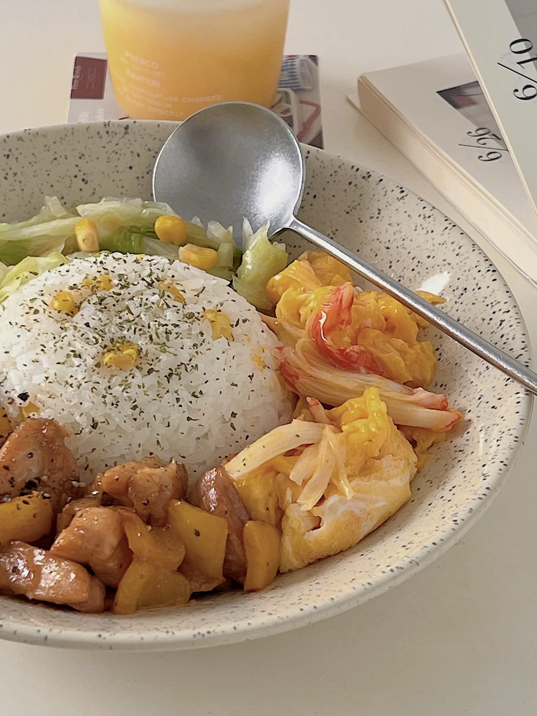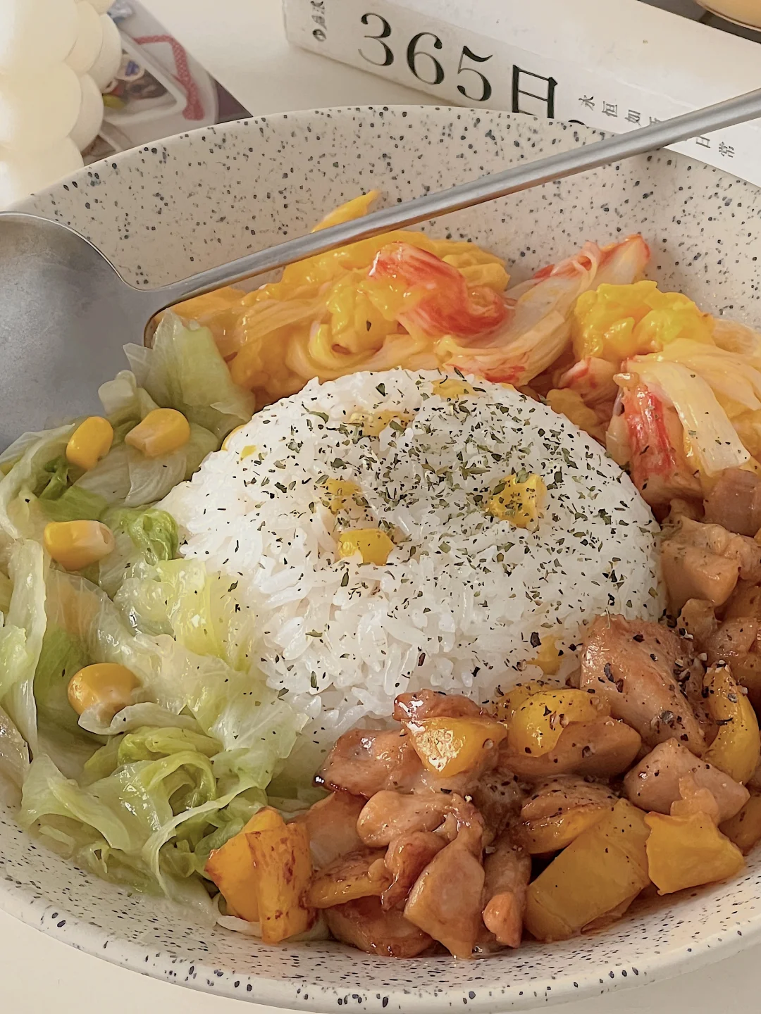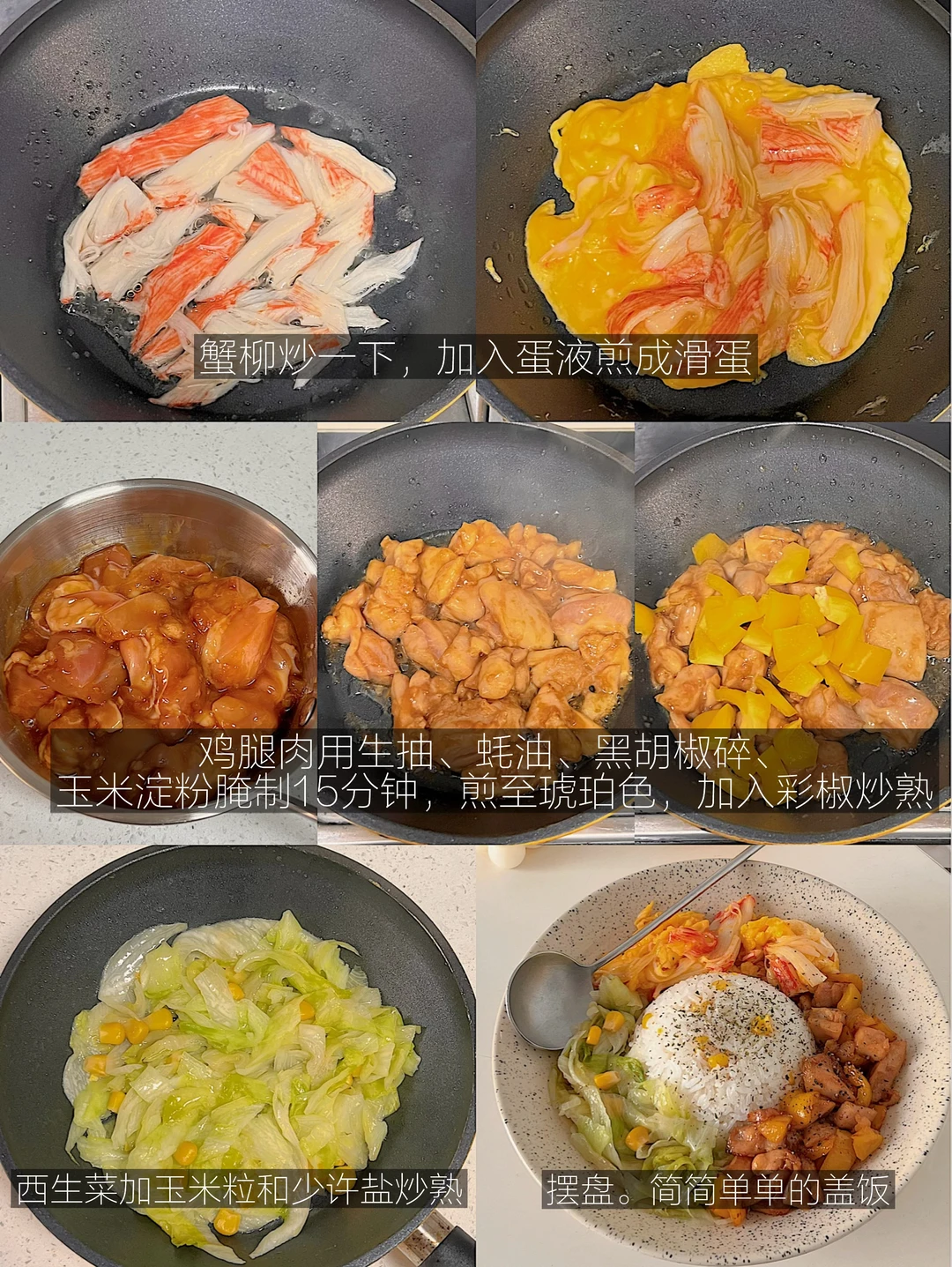 简单的低卡版盖饭,又光盘了嘿嘿 做法见图3️⃣ ✨蟹柳炒熟,淋入蛋液煎成滑蛋 ✨鸡腿肉用生抽、蚝油、黑胡椒碎、玉米淀粉腌制15分钟后,煎至琥珀色,加入彩椒炒熟 ✨炒西生菜,加入玉米粒和少许盐炒熟即可 ✨简单摆盘再来一杯饮品🥤 很简单的一人食,不知道吃什么就吃它吧。