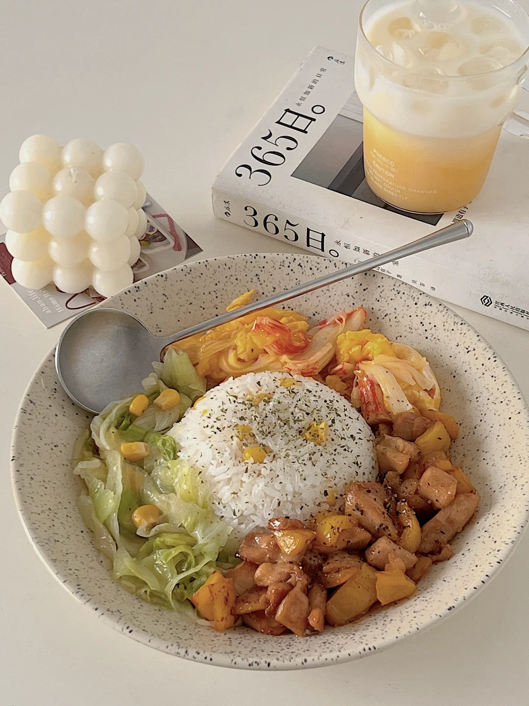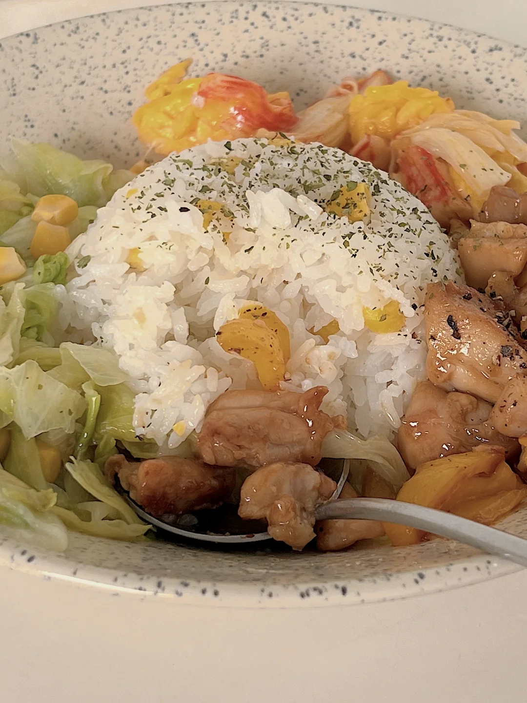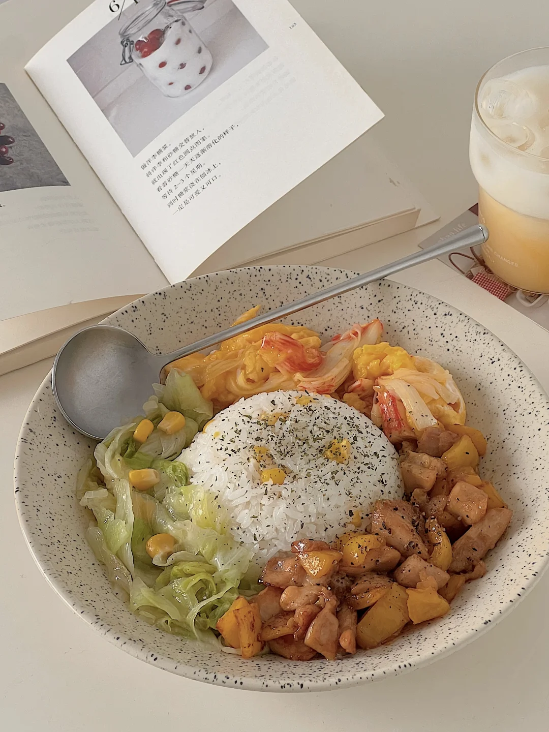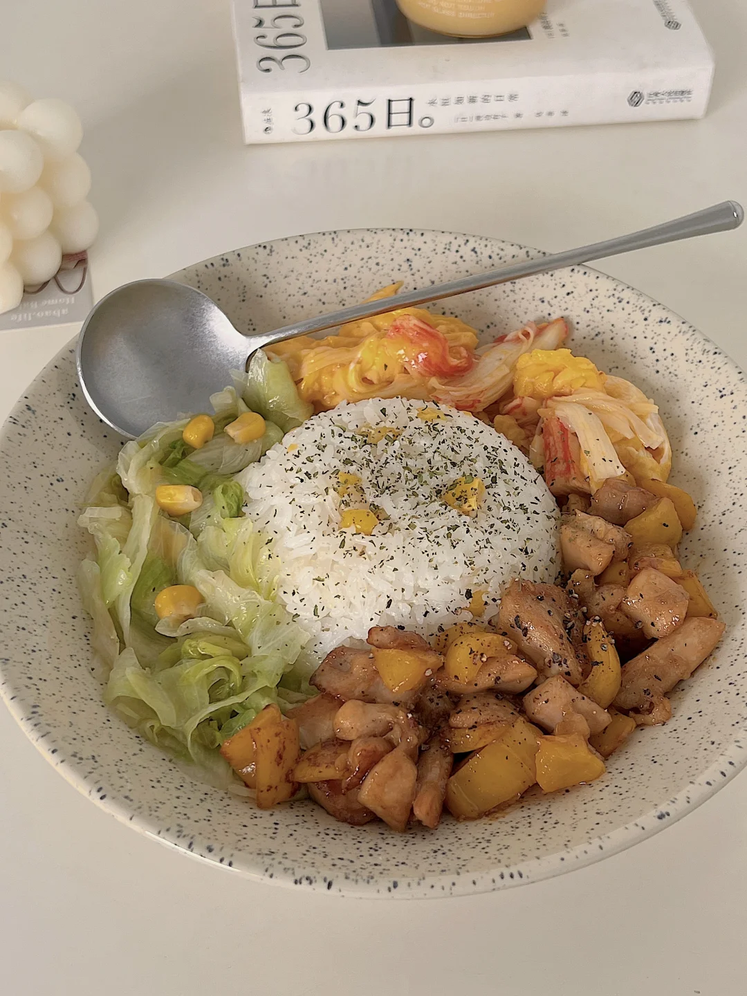 简单的低卡版盖饭,又光盘了嘿嘿 做法见图3️⃣ ✨蟹柳炒熟,淋入蛋液煎成滑蛋 ✨鸡腿肉用生抽、蚝油、黑胡椒碎、玉米淀粉腌制15分钟后,煎至琥珀色,加入彩椒炒熟 ✨炒西生菜,加入玉米粒和少许盐炒熟即可 ✨简单摆盘再来一杯饮品🥤 很简单的一人食,不知道吃什么就吃它吧。