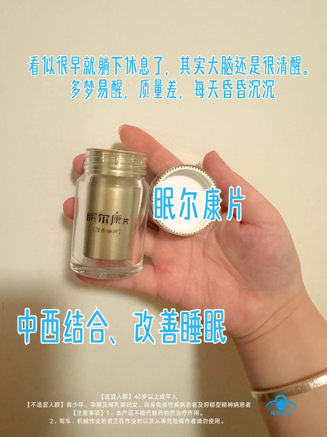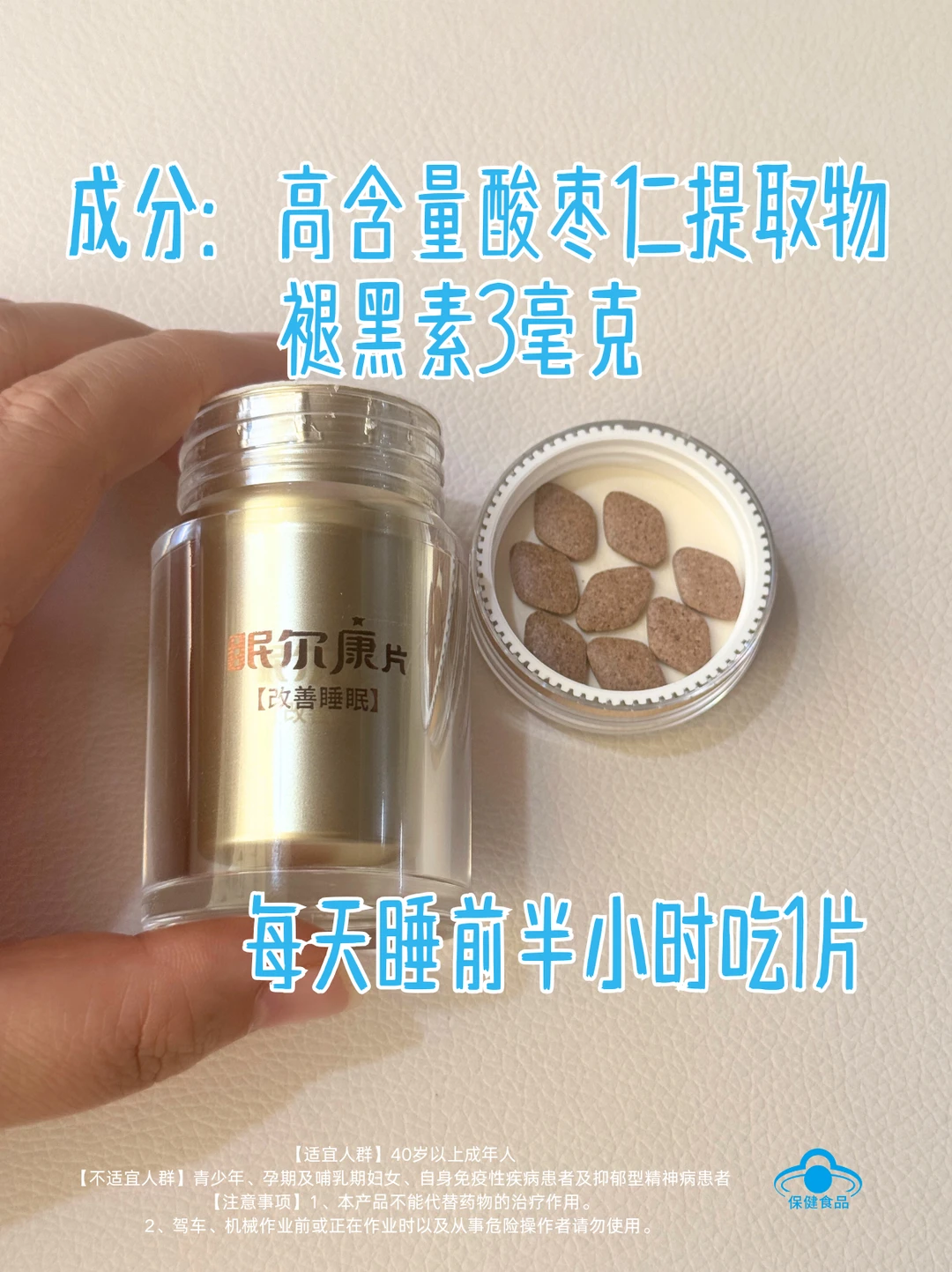 睡不好觉,真的很影响状态。 如果你也常躺下很久睡不着、夜里易醒、早起还是累,也许需要给大脑补充些“睡眠营养”。 【眠尔康片】含科学搭配的助眠成分: 🌿 酸枣仁提取物+🌙 褪黑素 中西结合、两者协同,从神经与节律双通路支持自然入睡。 【适宜人群】40岁以上成年人 【不适宜人群】青少年、孕期及哺乳期妇女、自身免疫性疾病患者及抑郁型精神病患者 【注意事项】1、保健品不是药物、本产品不能代替药物的治疗作用。 2、驾车、机械作业前或正在作业时以及从事危险操作者请勿使用