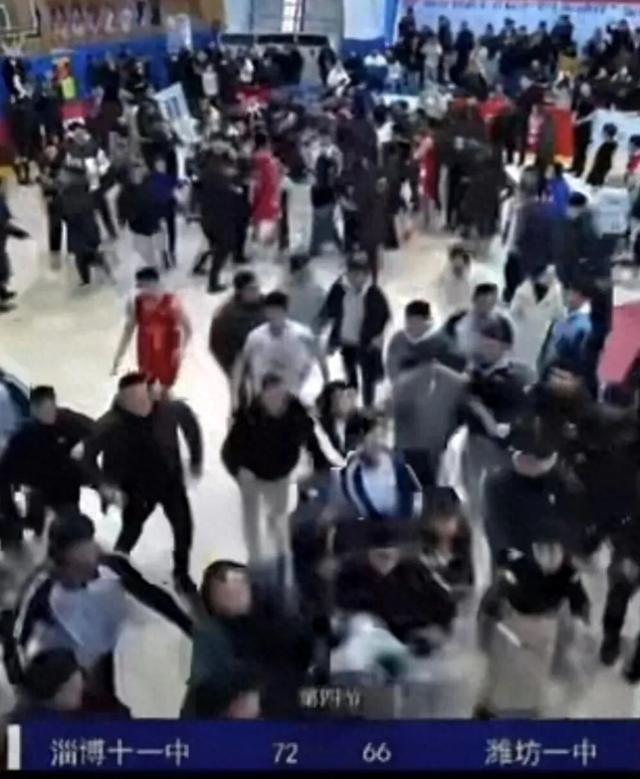 有媒体此前报道,在20日淄博十一中和潍坊一中的篮球比赛后发生冲突,有球员情绪激动多次挥拳,还有家长等场外人员冲入场地,现场一片混乱。