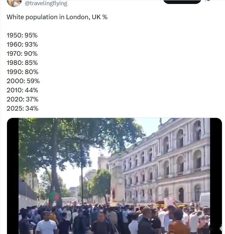 英国伦敦白人人口比例:1950 年:95%1960 年:93%1970 年:90%1980 年:85%1990 年:80%2000 年:59%2010 年:44%2020 年:37%2025 年:34%