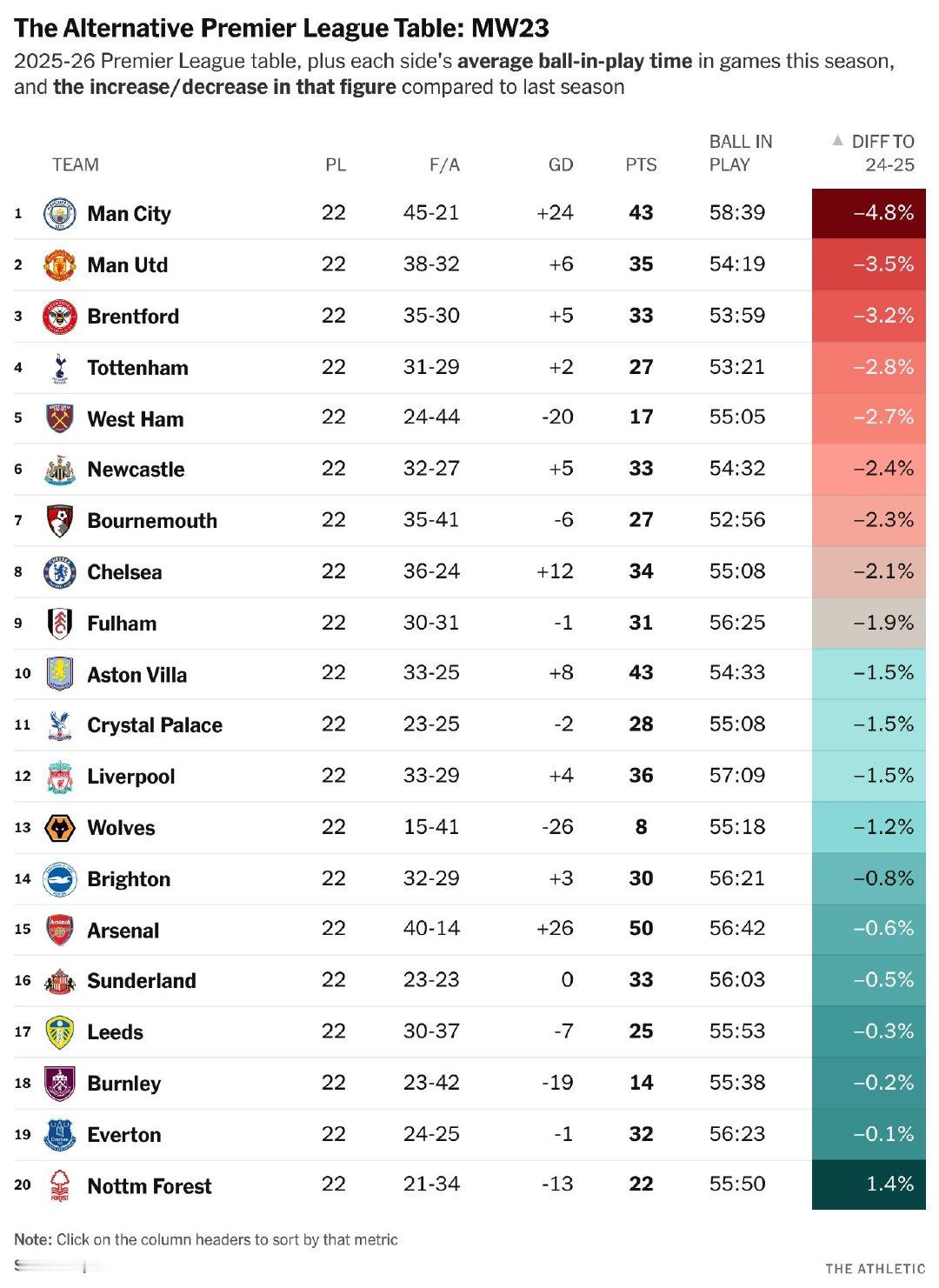 TA消息,本赛季英超联赛的场均实际比赛时间较上赛季大幅下降。⚫ 伯恩茅斯与热刺的比赛有效时间最短🔵 曼城比赛有效时间最高,但正在急剧减少...🤔 仅有一支球队的比赛有效时间比2024-25赛季有所增加英超联赛 阿森纳