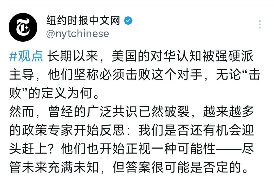 《纽约时报》重磅发声:美国在对华博弈中,追不上中国了! 1月22日,《纽约时报》发文写道:“长期以来,美国的对华认知被强硬派主导,他们坚称必须击败这个对手,无论‘击败’的定义为何。然而,曾经的广泛共识已然破裂,越来越多的政策专家开始反思:我们是否还有机会迎头赶上?他们也开始正视一种可能性——尽管未来充满未知,但答案很可能是否定的。” [机智]纽约时报喊出举白旗,不过是美国硬刚中国后的现实认怂!当年美苏冷战美国靠霸权赢下对局,如今复刻新冷战对华,却落得关税反噬通胀飙升、制造业岗位净减7万的惨状。53%美国民众支持对华合作,连精英都开始慌了追不上,中国AI专利占全球38.58%、新能源领跑世界,硬实力让美式压制彻底失灵。美国的失败从不是对手太强,而是冷战思维早已跟不上时代,一边喊着击败中国,一边被自己的霸权套路拖垮,这场自导自演的新冷战,终究是搬起石头砸了自己的脚!