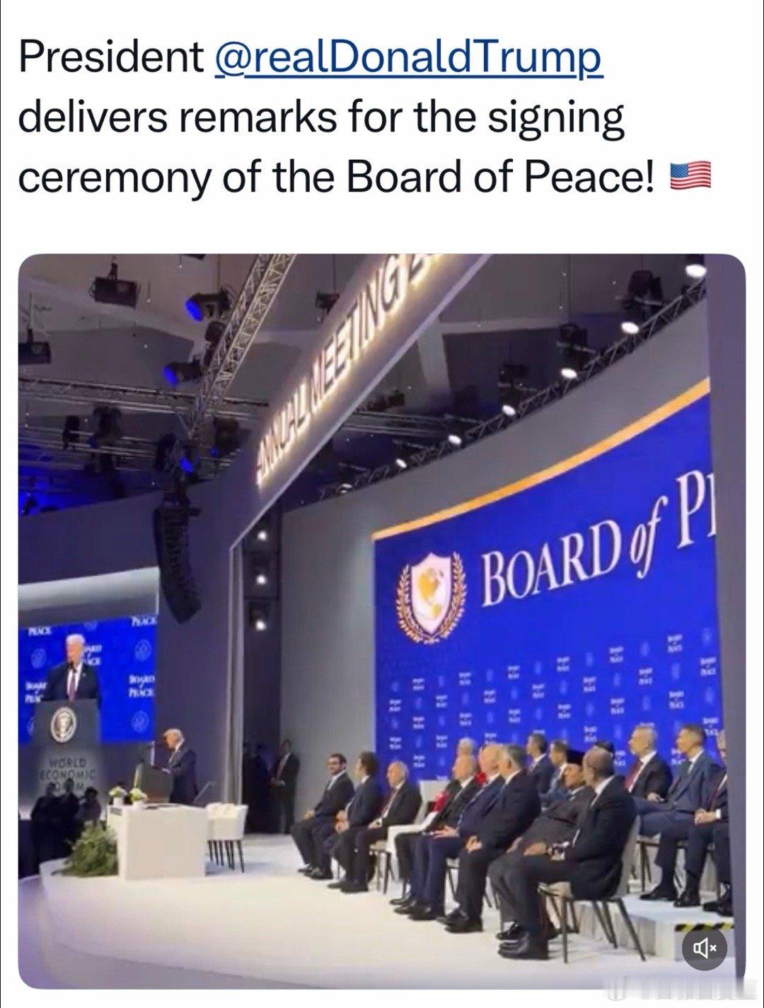 美国总统在达沃斯主持“和平委成立”签字仪式,参加的政府首脑有:匈牙利总理、印尼总统、阿根廷总统、亚美尼亚总理、阿塞拜疆总统、哈萨克斯坦总统派代表出席的国家有:巴林、约旦、科索沃、巴基斯坦、巴拉圭、卡塔尔、沙特、土耳其、阿联酋、乌兹别克斯坦、蒙古、摩洛哥等