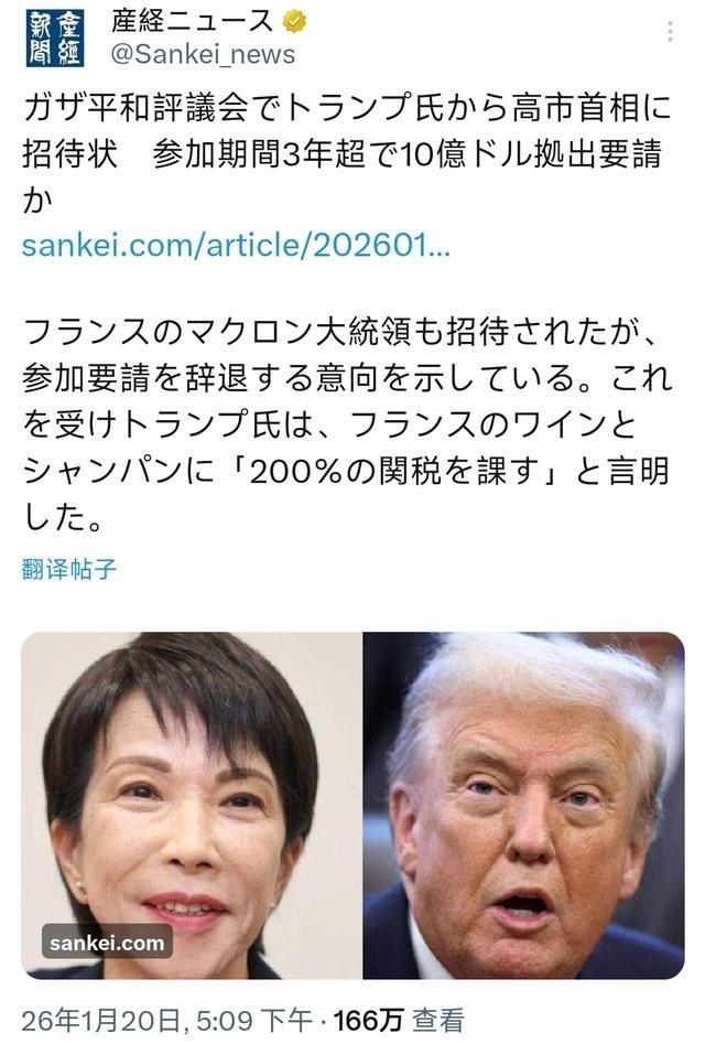 1月20日,日本方面也正式官宣,高市早苗收到了特朗普发来的“参加和平委员会”的邀请。那么日本官方和民间如何看待这件事呢?如此亲美的高市,会把加入和平委员会,当做3月20日访美的“投名状”吗?首先,和中方类似,日本也是1月17日就接到了邀请,但直到1月20日才对外公布,可见日本官方的谨慎。 日本外务省1月20日确认收到美国邀请,邀请高市早苗政府加入特朗普主导的“和平委员会”,也就是Board of Peace,主要针对加沙战后治理,但章程草案显示范围可能扩大到全球冲突。委员会由特朗普终身当主席,永久成员得在首年掏10亿美元现金,其他成员任期最多三年。美方已经发邀请给全球60多个国家,但响应冷淡,目前只有匈牙利、摩洛哥、以色列等少数明确加入,法国马克龙直接拒绝,加拿大、沙特等在观望或质疑运作方式,担心这玩意儿平行于联合国,甚至挑战联合国权威。 日本官方态度跟其他西方盟友差不多,挺谨慎。外务省声明说支持推动和平,但要花时间仔细研究委员会的性质、运作机制、跟联合国关系,以及出资问题,不会马上表态积极加入。日本政府内部估计先看法国、德国这些盟友怎么动,再决定。毕竟10亿美元不是小数,在日本当前财政压力下,海外大笔支出容易挨批。更何况委员会主席权力太大,决定得经特朗普批准,这让东京觉得风险不小,怕被绑架进一个美国主导的平行体系。 高市早苗本人亲美是出了名的,她上台后反复强调日美同盟,之前就提过特朗普该拿诺贝尔和平奖那种话。这次邀请对她来说,本来是个拉近关系的机会,但官方拖到三天后才公布,明显是掂量再三。民间反应就更热闹了,日本网友在网上炸锅,主要骂高市“亲美过头”“拿纳税人钱给特朗普买面子”。很多人讽刺这10亿美元等于买特朗普的“和平奖章”,质疑为什么日本要为一个可能成“私人俱乐部”的东西出血。部分人担心日本彻底变成美国附庸,外交独立性没了。还有人翻旧账,说高市过去对特朗普的表态就是谄媚,现在又来这一出。支持的声音有,但很少,说加入能加强日美同盟,顺便在中东重建刷存在感,可惜淹没在反对声里。整体看,日本舆论对海外巨额支出和过度依美特别敏感,尤其经济日子不好过的时候,这种不满更容易放大。 高市把加入当成3月20日访美“投名状”的可能性不小。她自己定位是特朗普的铁杆伙伴,又想继承安倍路线,特朗普特别在乎个人荣誉和盟友表态。要是公开拒绝,访美估计黄了不说,日美关系还可能出裂痕。所以短期内,日本不太可能在2月8日众议院选举前宣布加入,那样容易被在野党拿来攻击,炒作“卖国”“浪费税金”。选举前执政党得避开这个雷区。 等2月中下旬新内阁稳住,高市很可能正式表态加入,出10亿美元拿永久席位,换特朗普在访美时给力支持。毕竟她急需在美国那边站稳脚跟,尤其在印太事务上想多要点保障。这事儿本质上就是高市在美日同盟框架下,继续走亲美路线,但国内压力大,玩得小心翼翼。总的来说,这反映出日本夹在美中之间,外交上想抱紧美国大腿,但又怕付出太多代价,民间又不买账,挺典型的纠结状态。